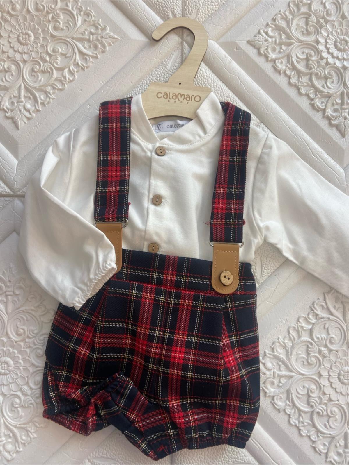Completo con camicia collo coreano e salopette tartan con bretelle