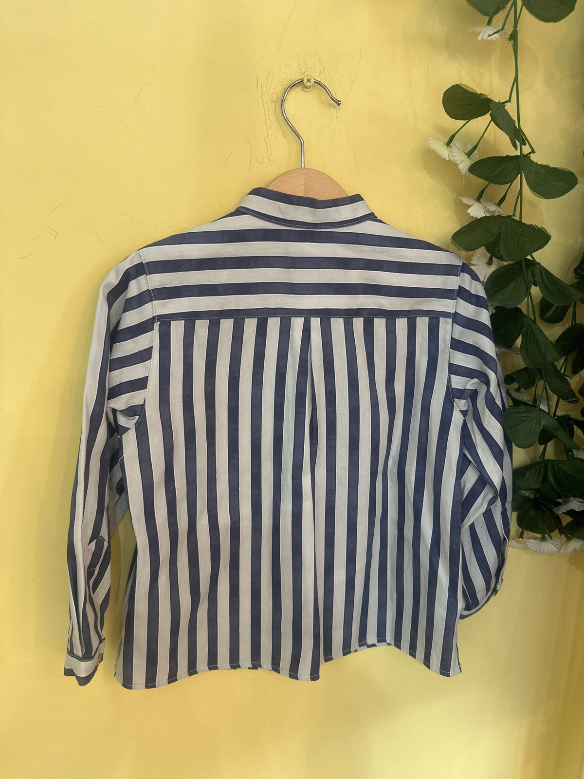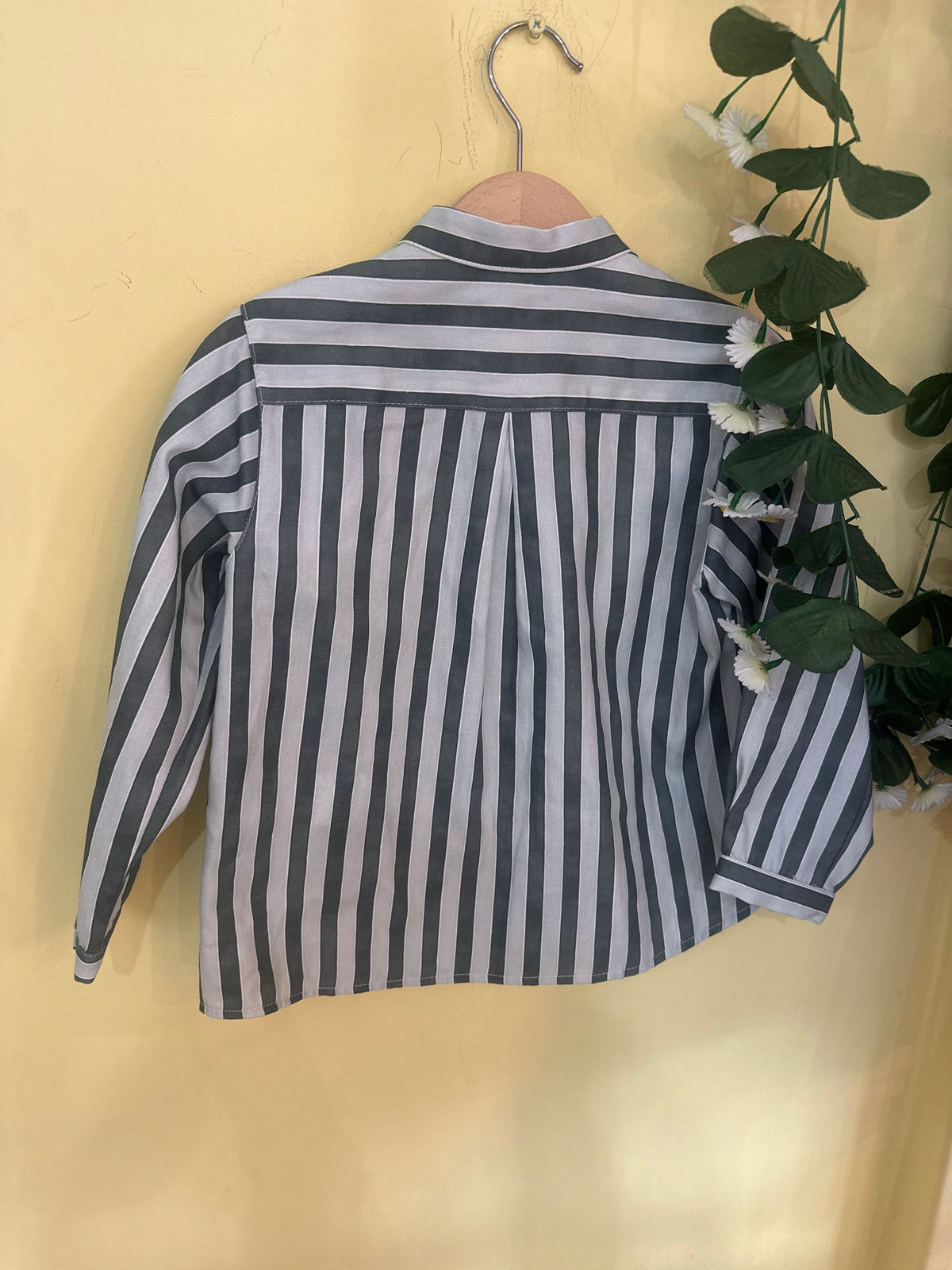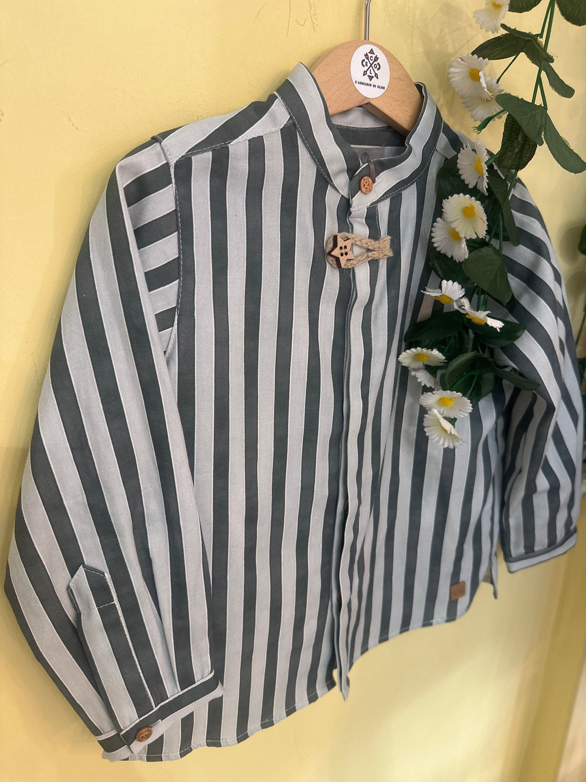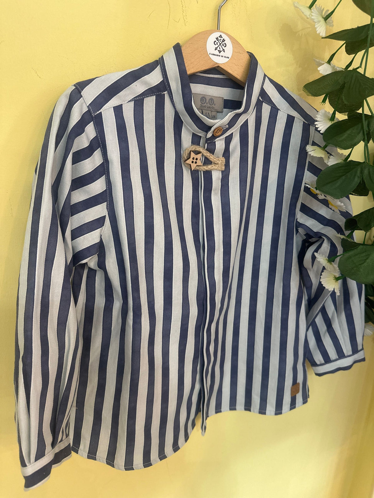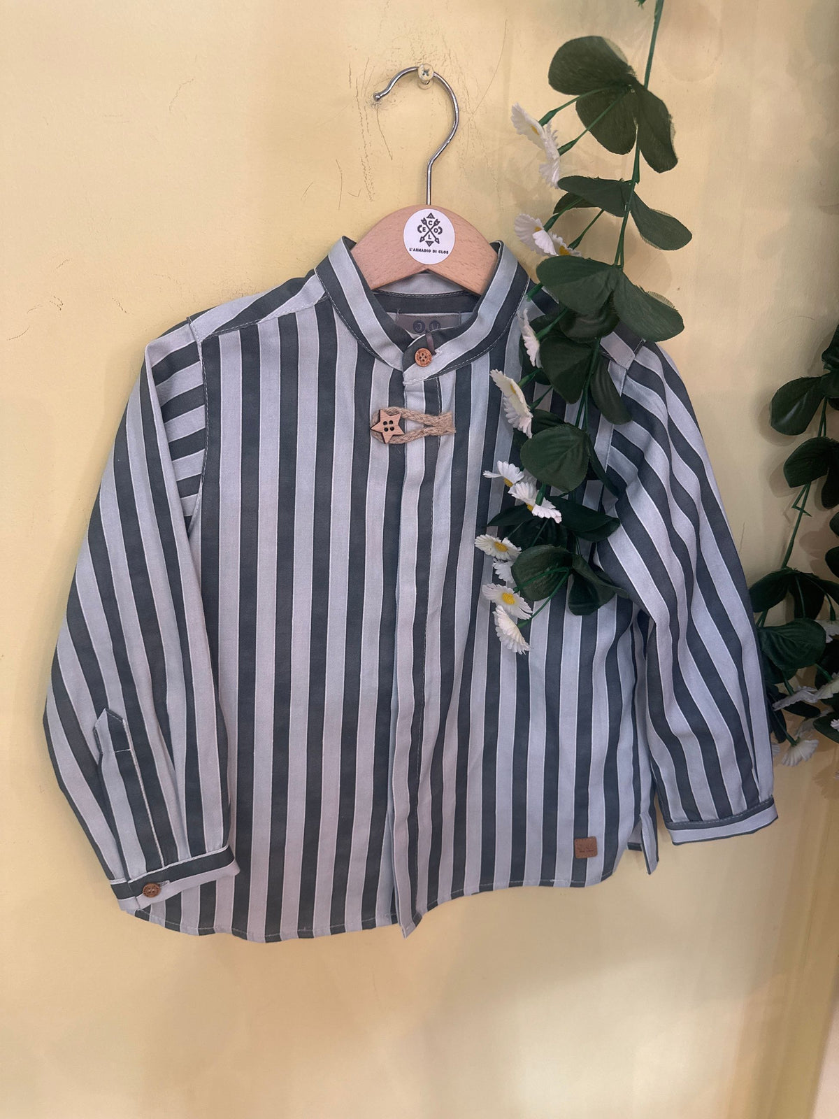 camicia in cotone fantasia a righe con collo coreano e manica lunga.la camicia porta l'abbottonatura a scomparsa sul davanti e i bottoni in legno,uno avanti a forma di stella che si chiude con alamaro in corda,è una camicia casual chic