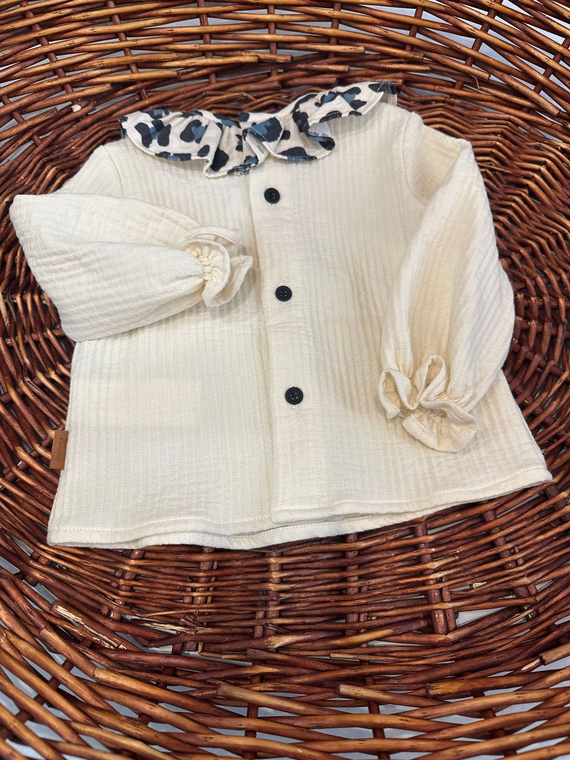 camicia in cotone garzato panna con collo rouches a contrasto, fantasia leopardata nero e celeste ,con manica lunga e bottoni sul retro la rendono comoda e pratica