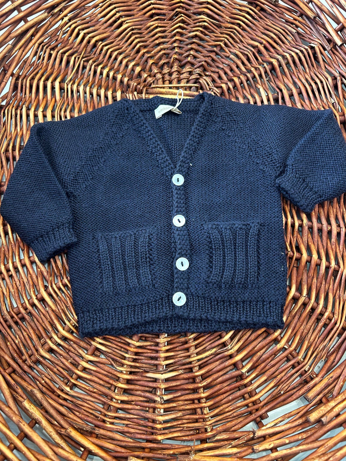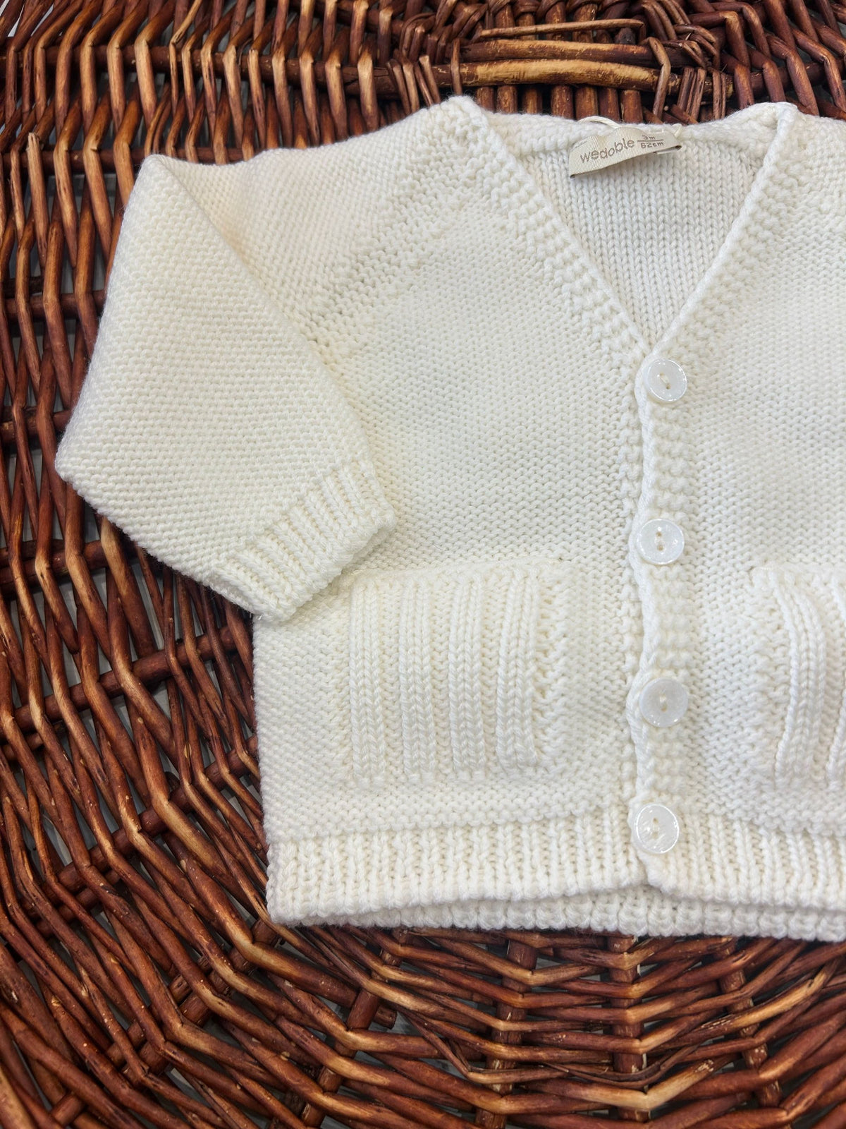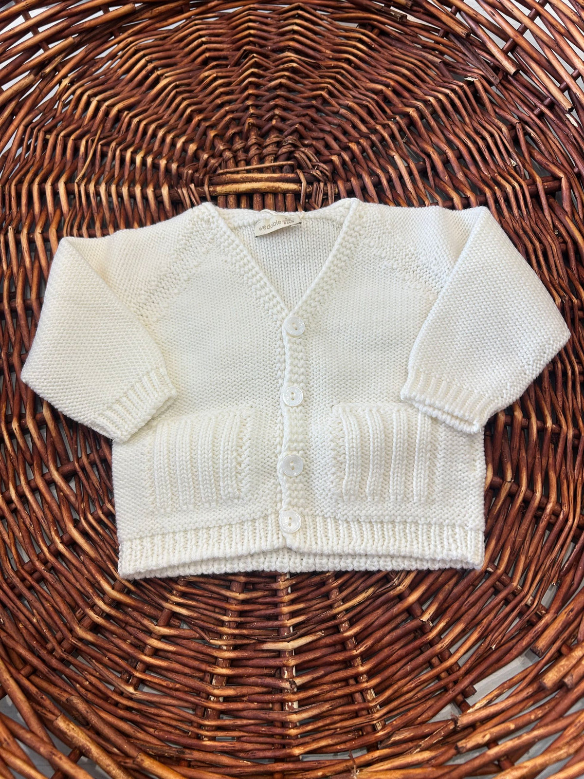 cardigan in pura lana merino lavorata a coste larghe con taschini,scollo a "V" e bottoncini in madreperla,classico ed raffinato