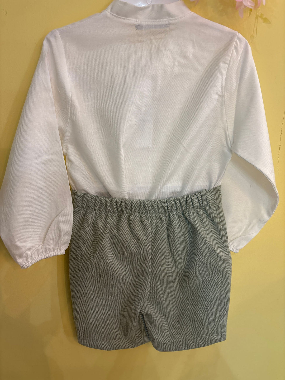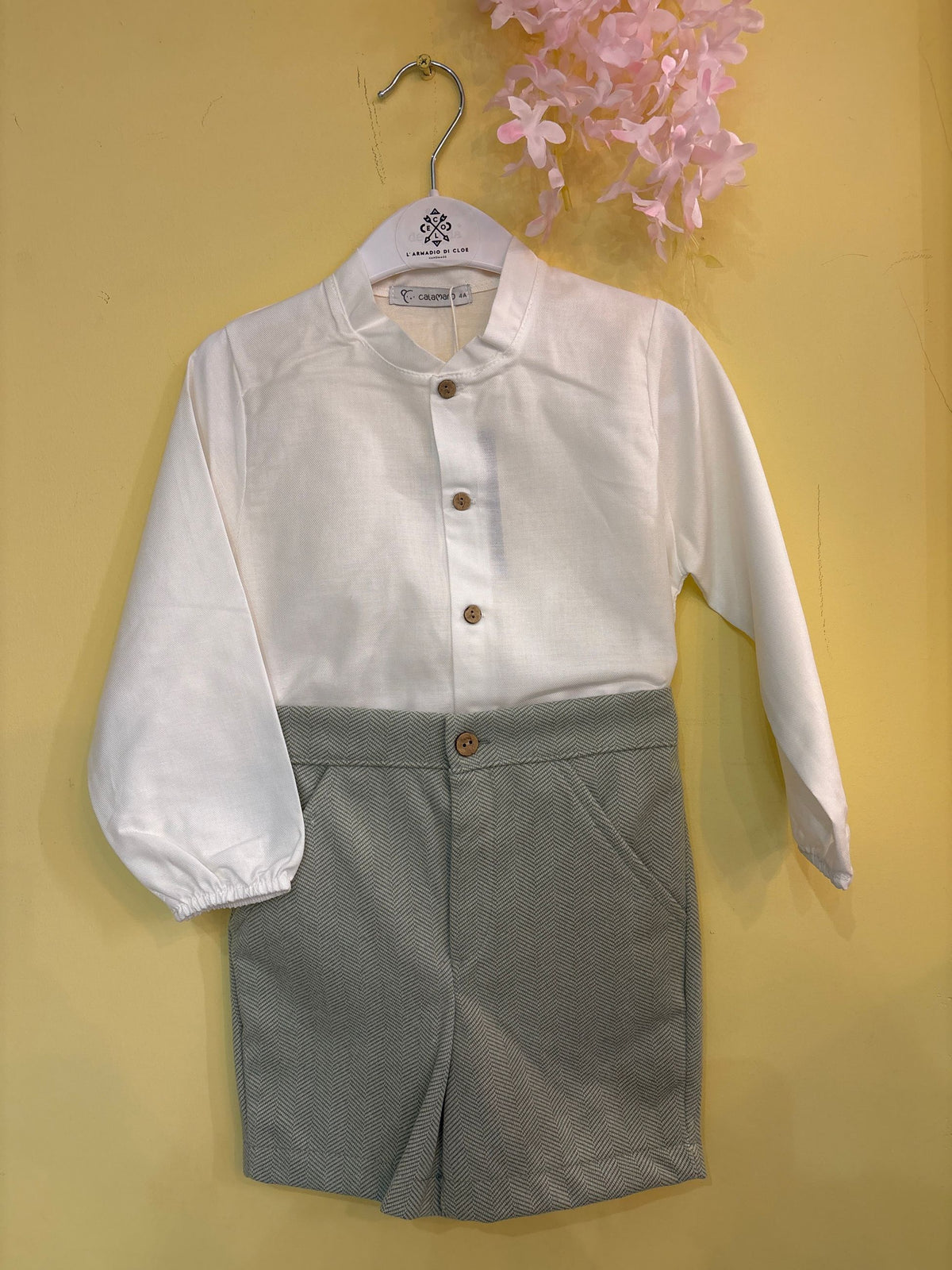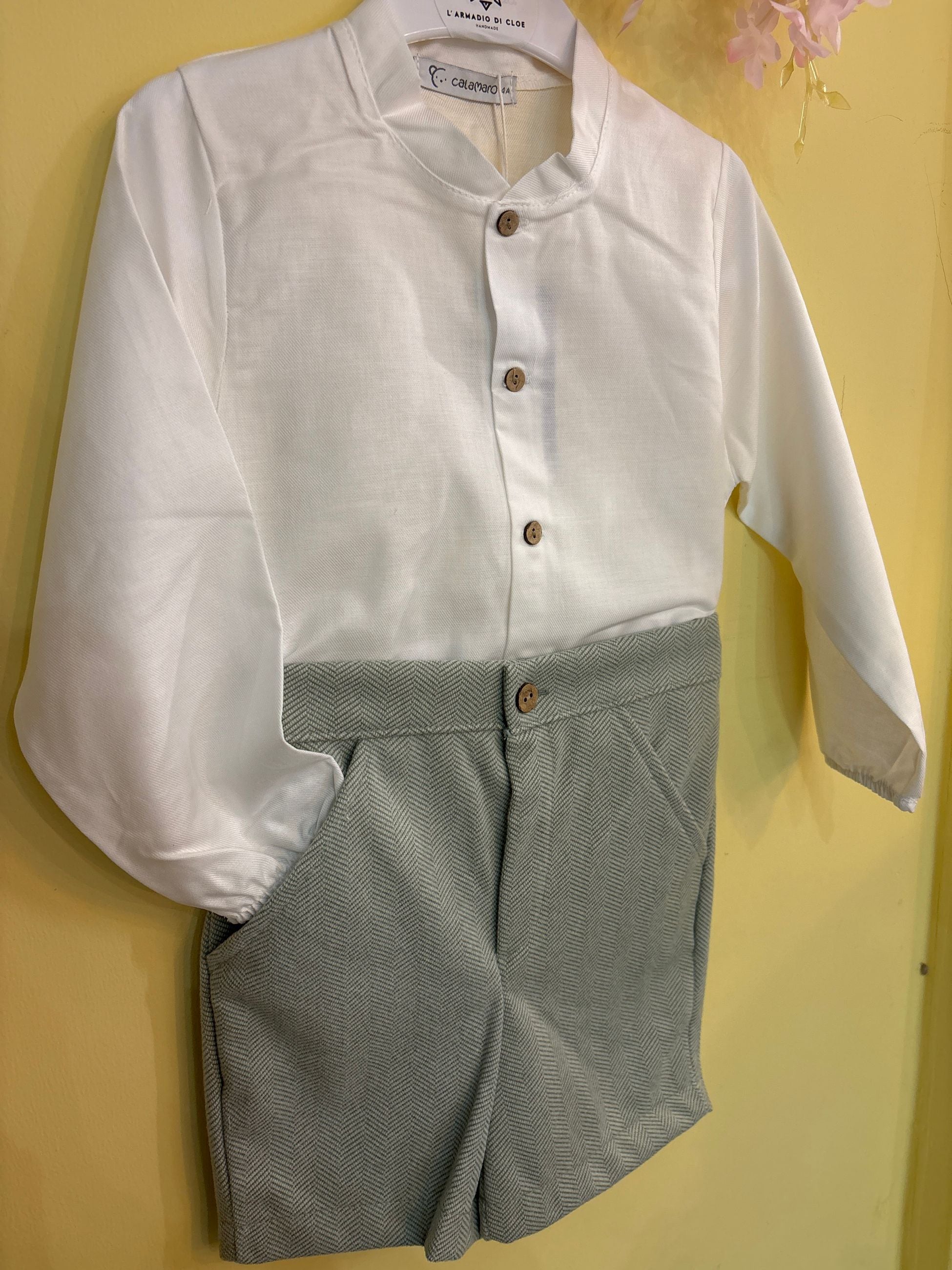 completo con camicia coreana con bottoni in legno e bermuda in tessuto spigato verde