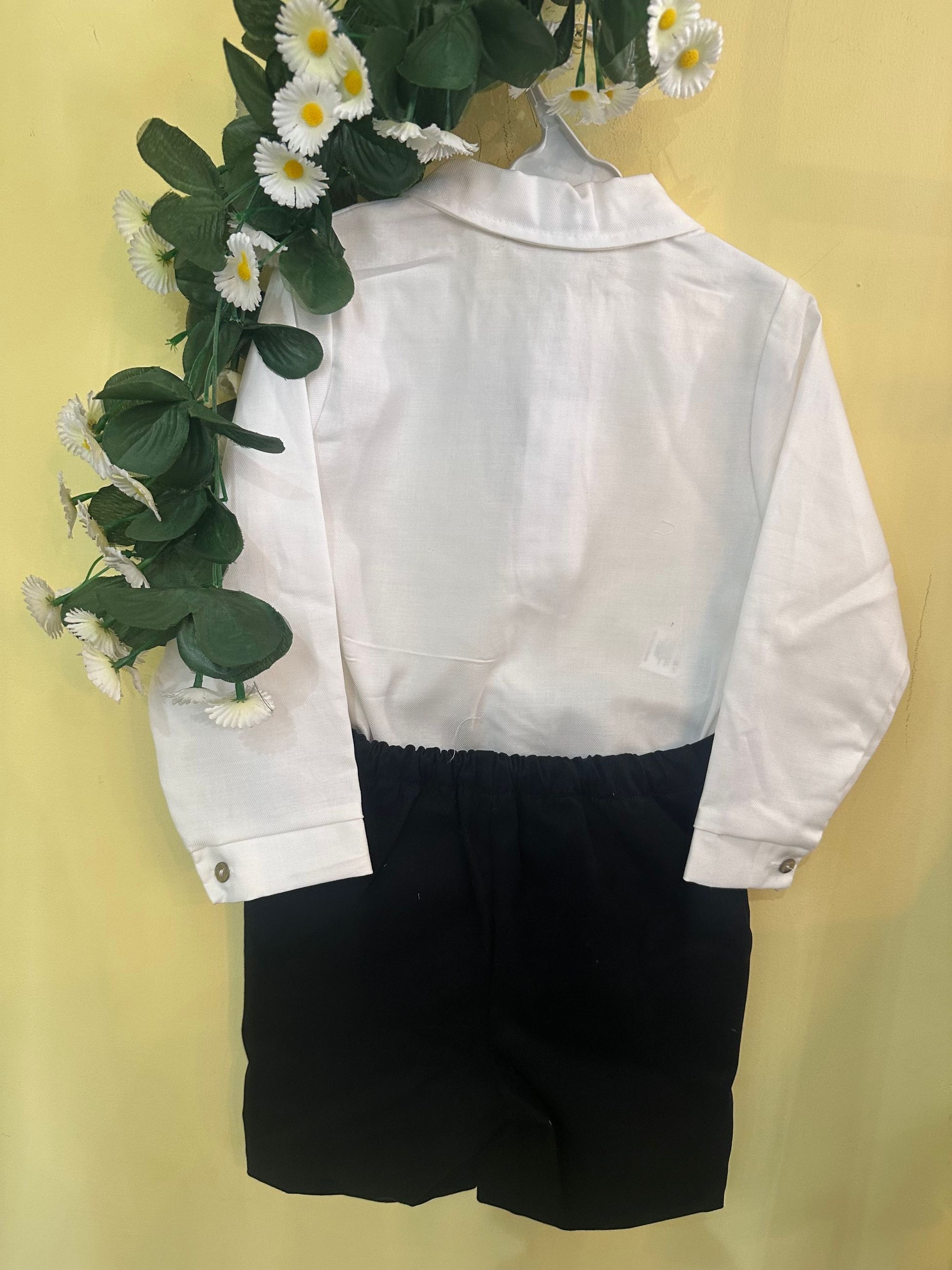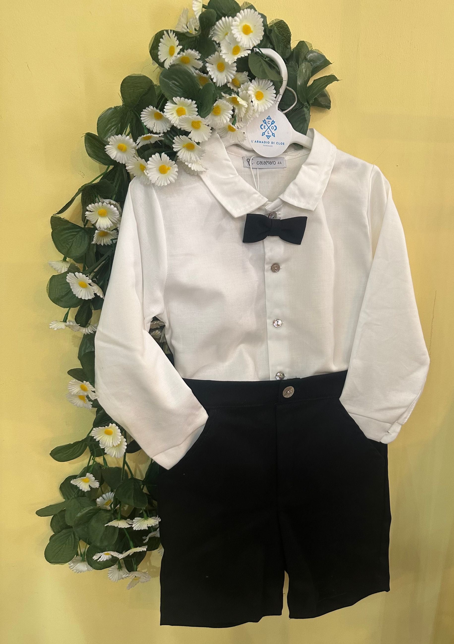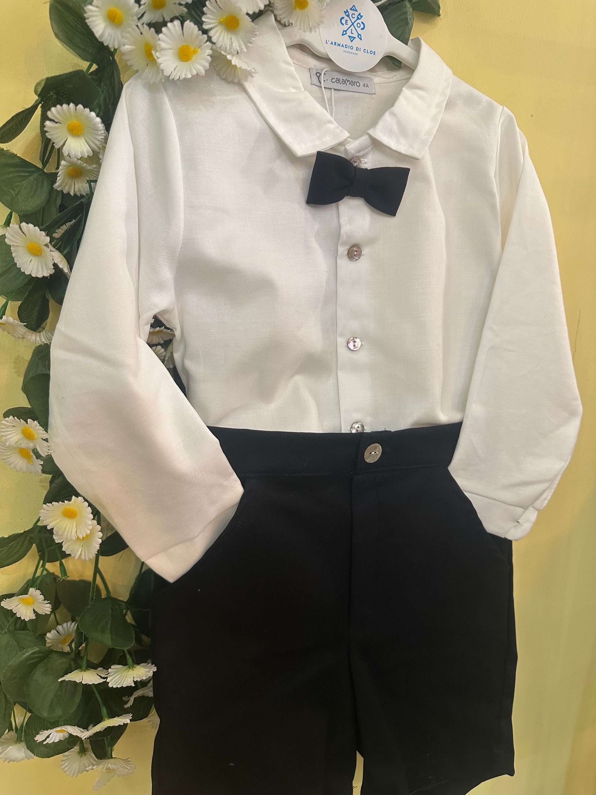 completo con camicia con collo a punta tinta unita con papillon removibile in cotone nero abbinato alla coulotte in cotone. un look super esclusivo per le sue feste più importanti