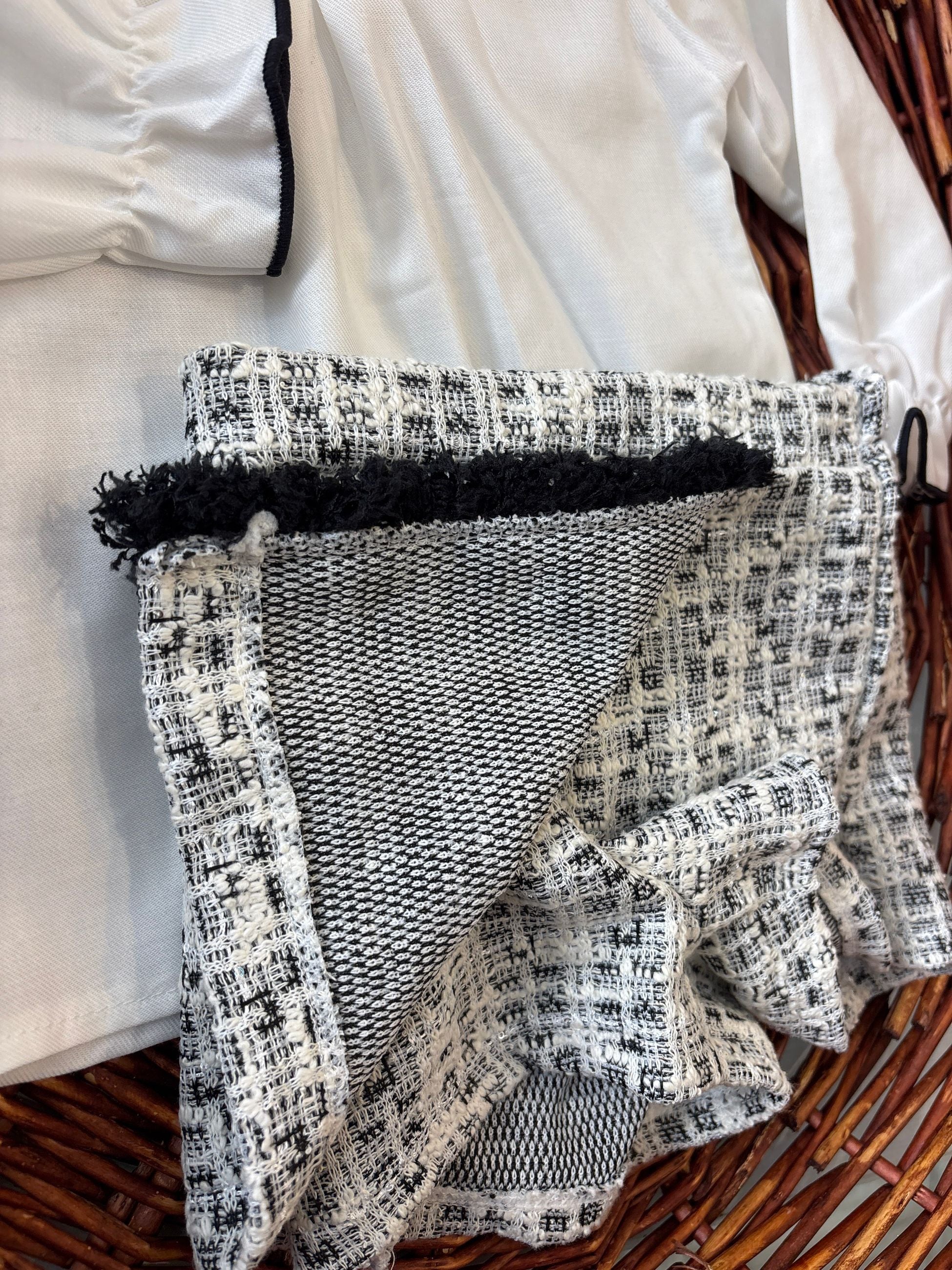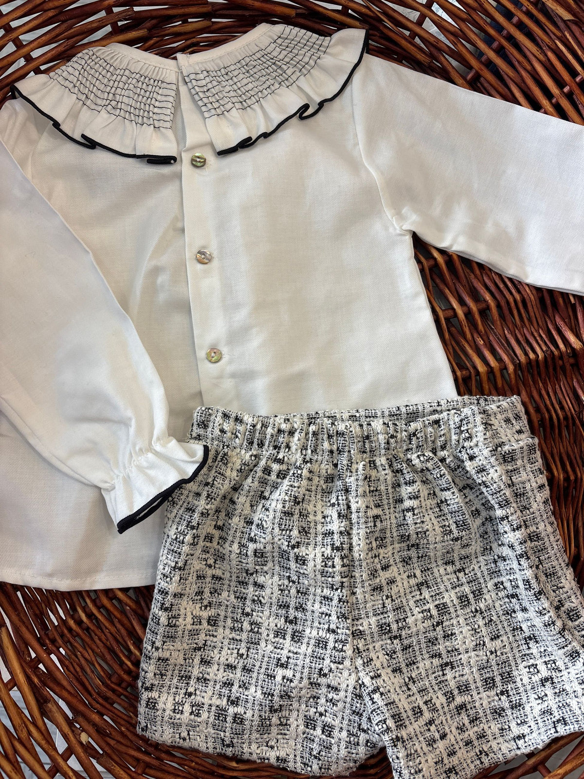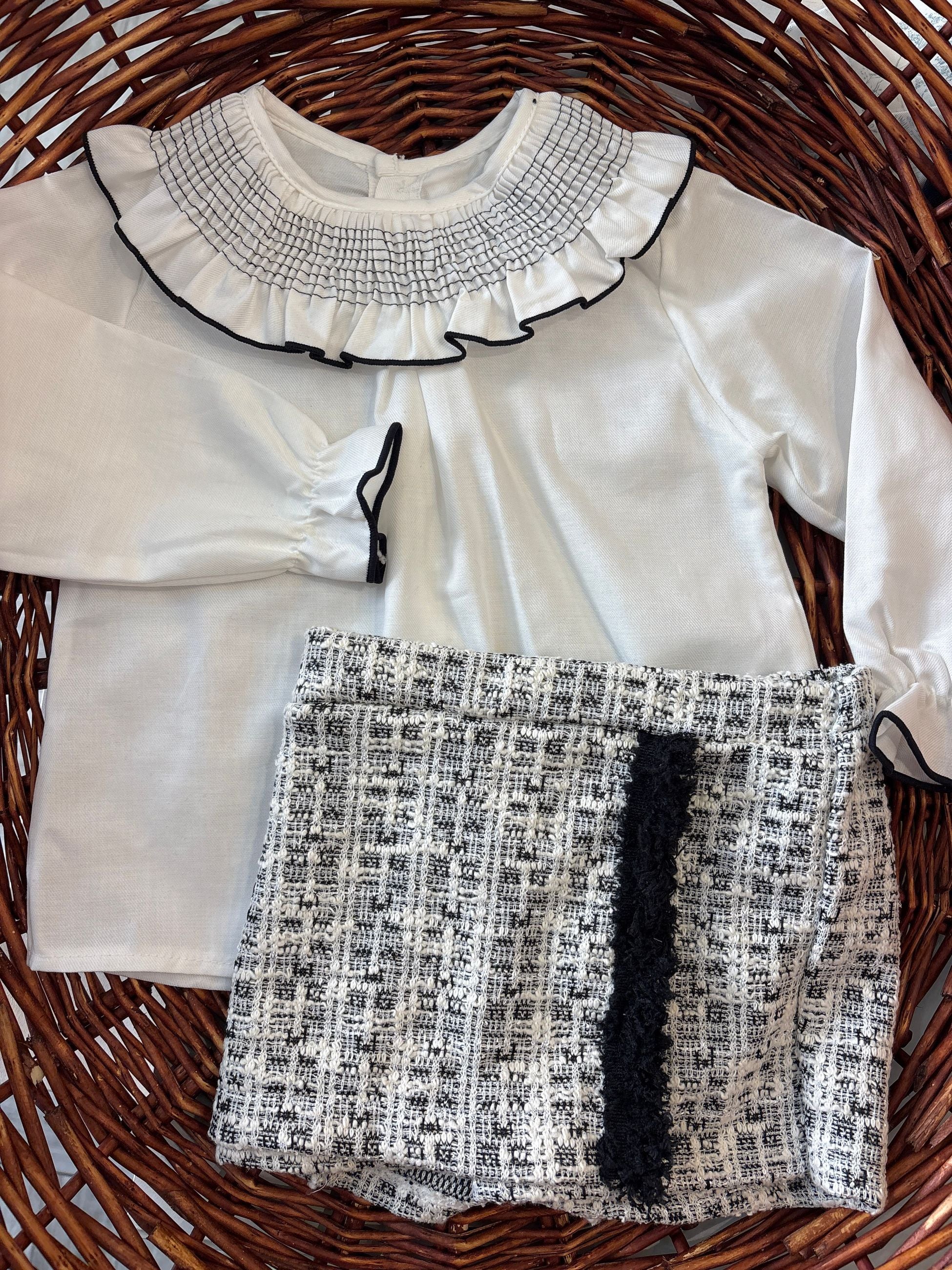 completo con camicia con collo tondocon punto smock bordato in nero per richiamare lo short a cuiè abbinata che fa un effetto finta gonna. comodissima ma anche esclusivo per le occasioni anche più esclusive grazie allo short