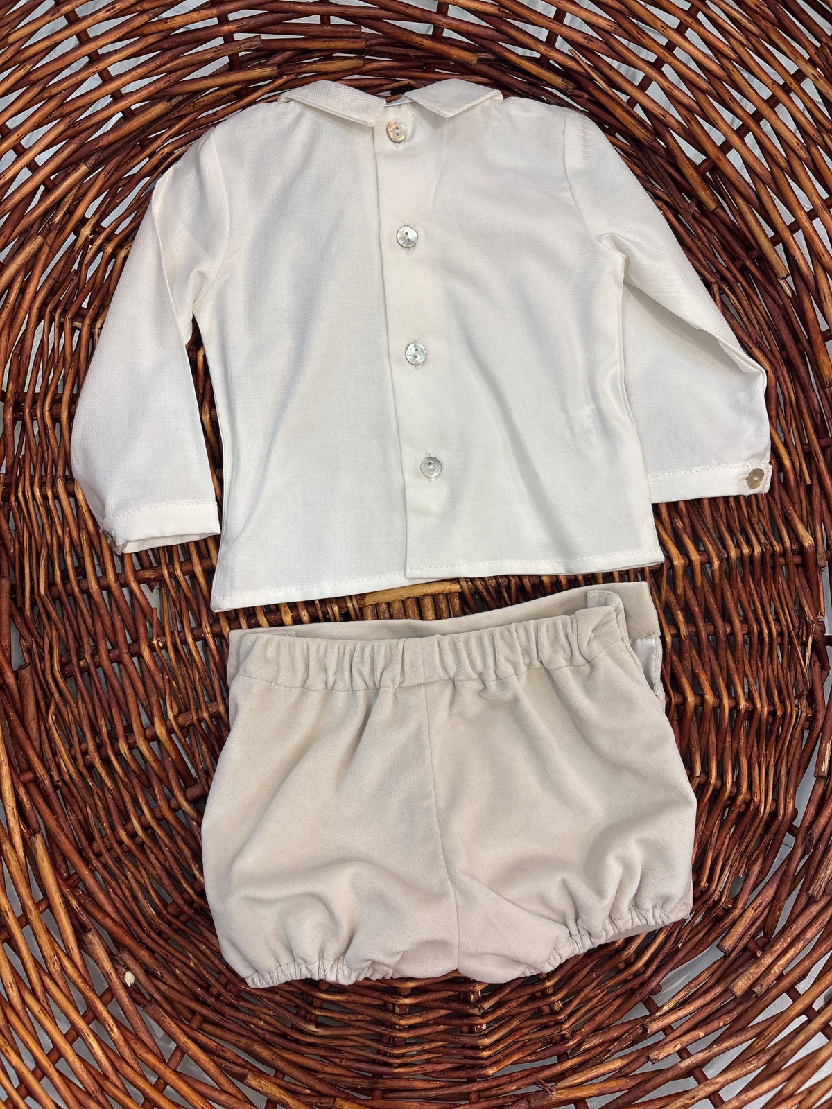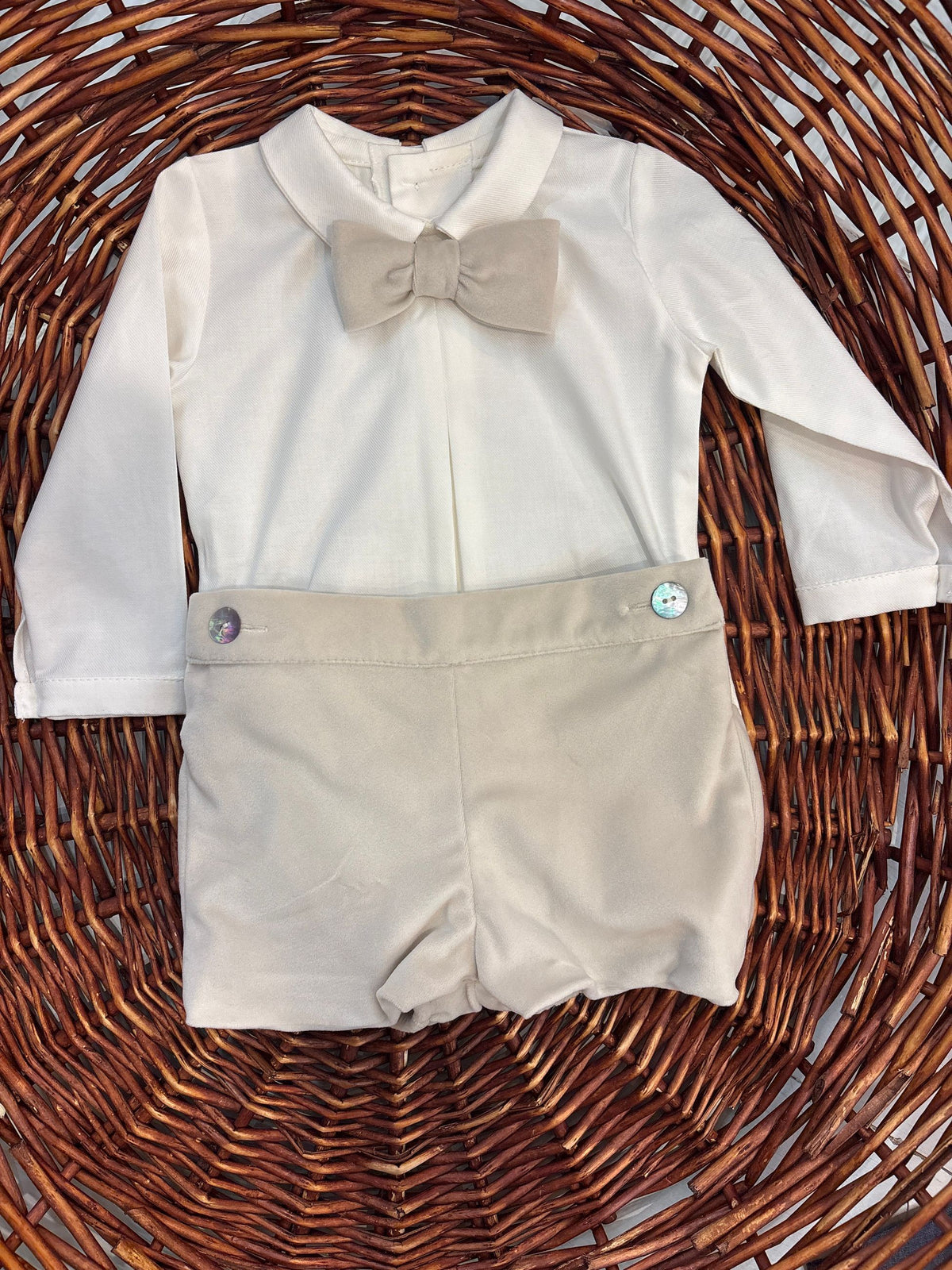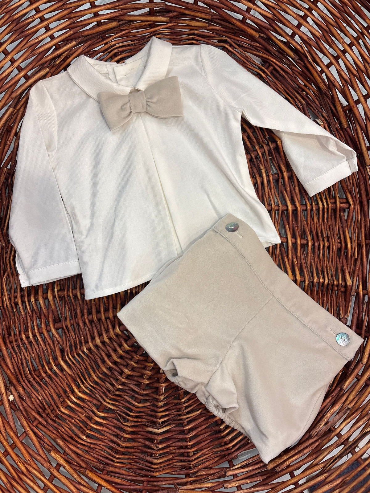 completo cerimonia in cotone e velluto liscio,elegante e comodo,la camicia si abbottona dietro e il bermuda porta due pratici bottoni in madreperla,completa il look un papillon regolabile in velluto