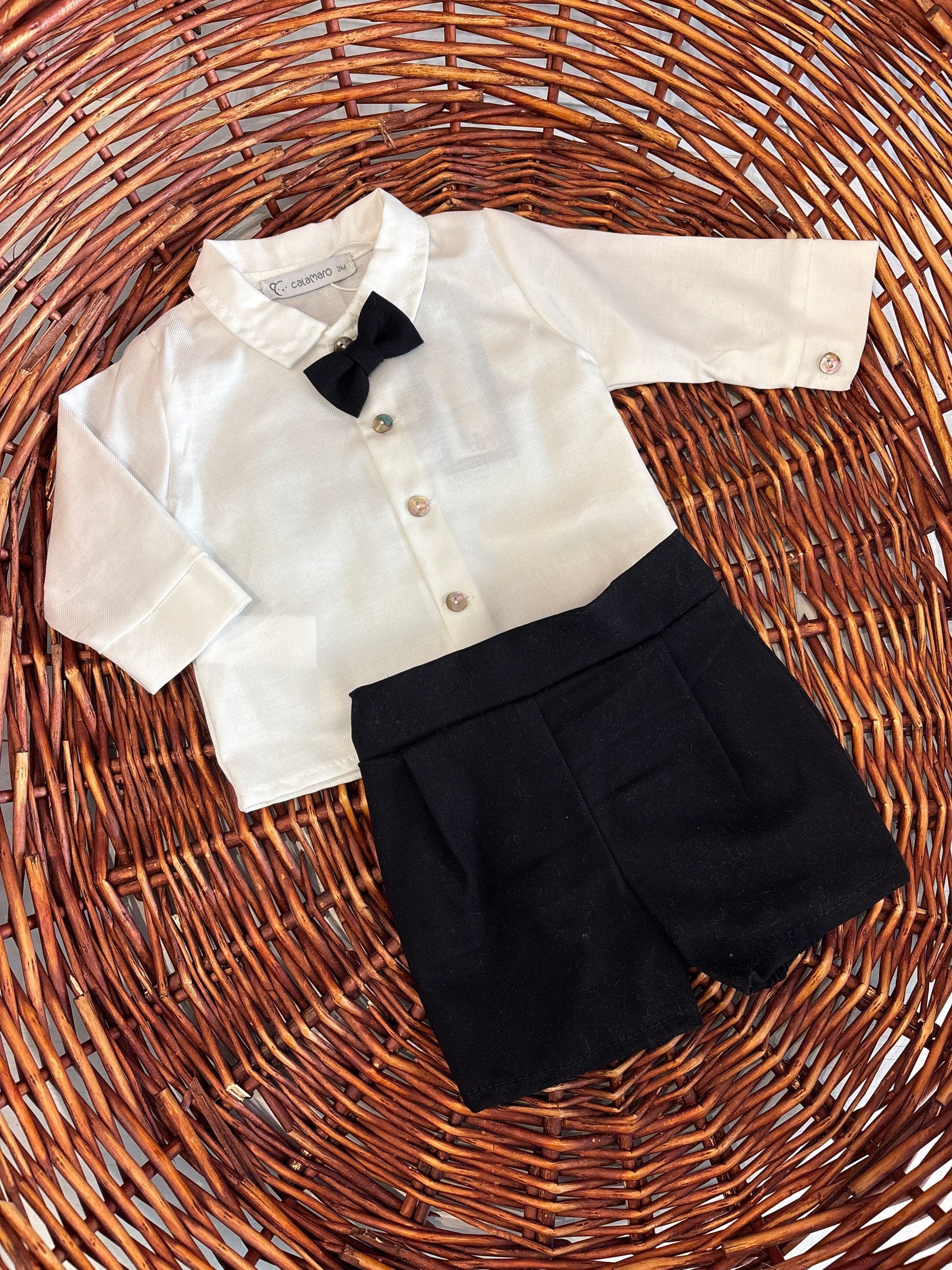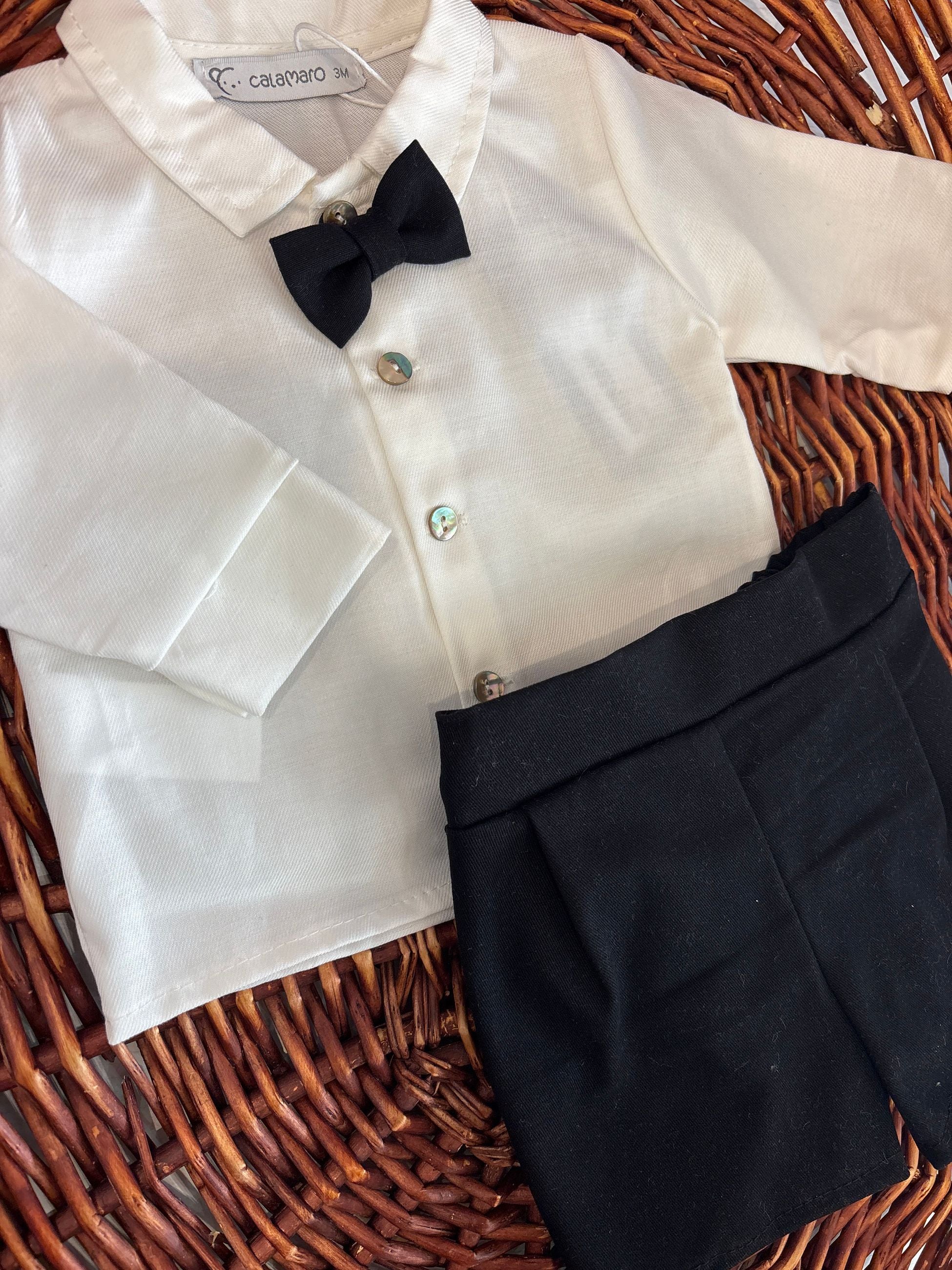 completo con camicia con collo a punta tinta unita con papillon removibile in cotone nero abbinato alla coulotte in cotone. un look super esclusivo per le sue feste più importanti