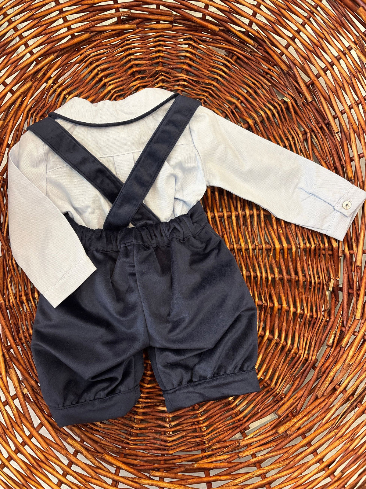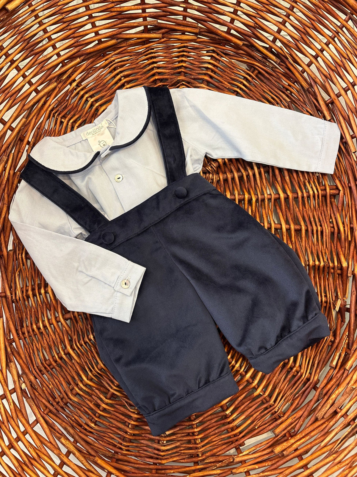 completo con camicia dal collo stondato e riporto a contrasto,la salopetteb in velluto liscio,porta le bretelle regolabili e i bottoni rivestiti