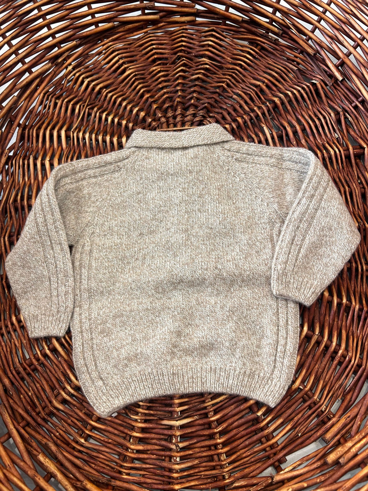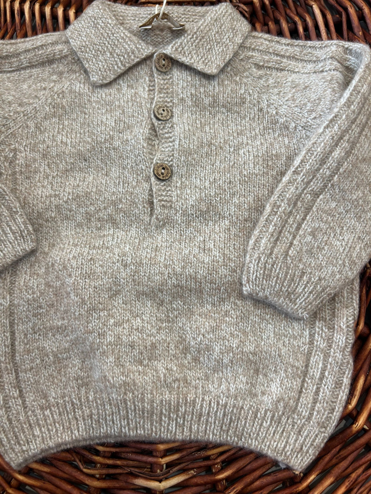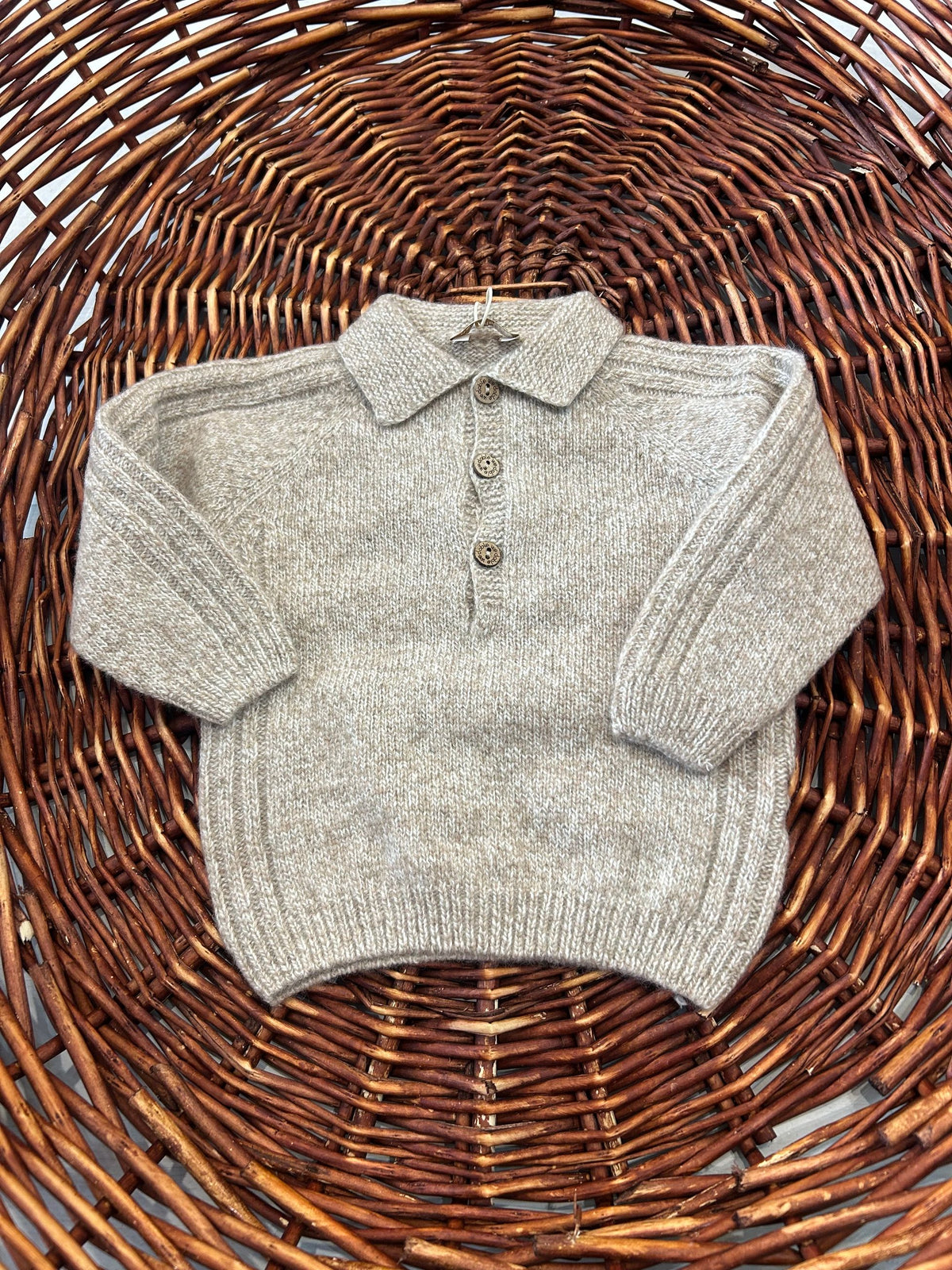 maglia modello polo in pura lana merino melange , bottoncini in legno al collo , e maniche lavorate a coste larghe ,sportivo e casual pur mantenendo una linea raffinata