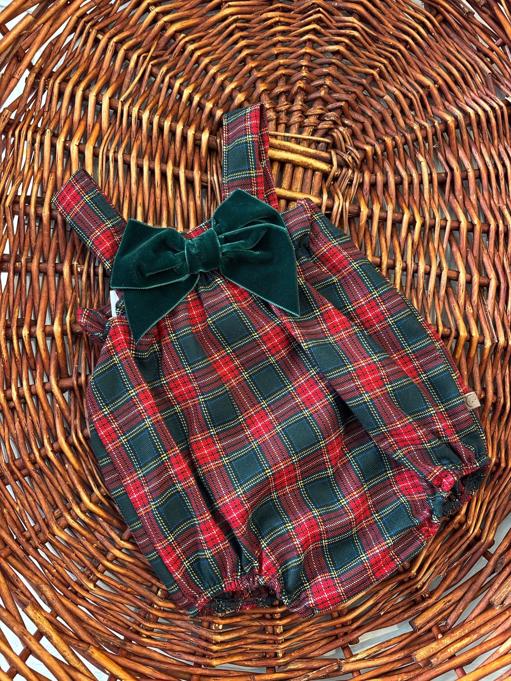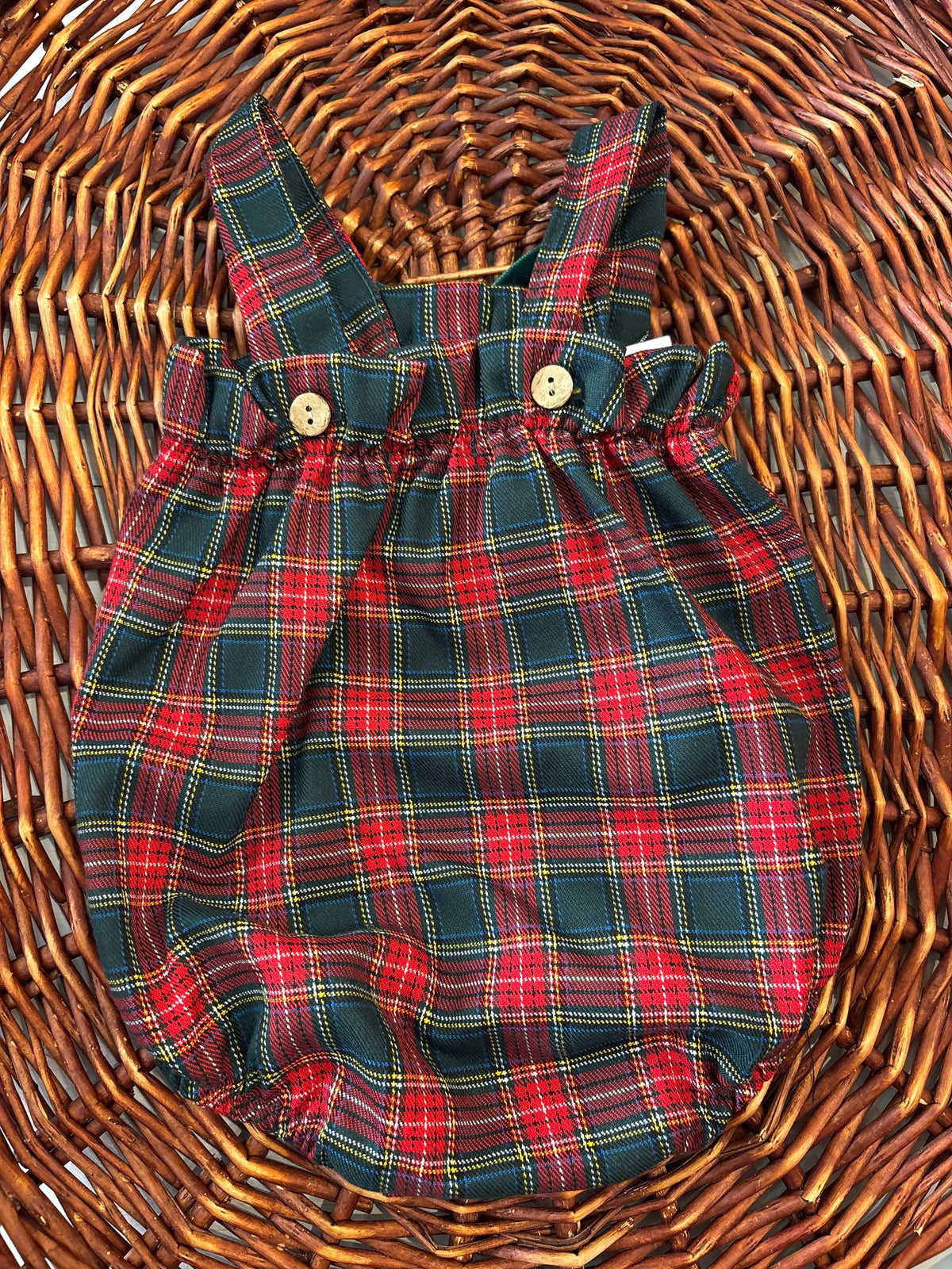 pagliaccetto con bretella tartan con fiocco in velluto verde e abbottonatura sotto con bottoncini in legno per rendere più pratio il cambio