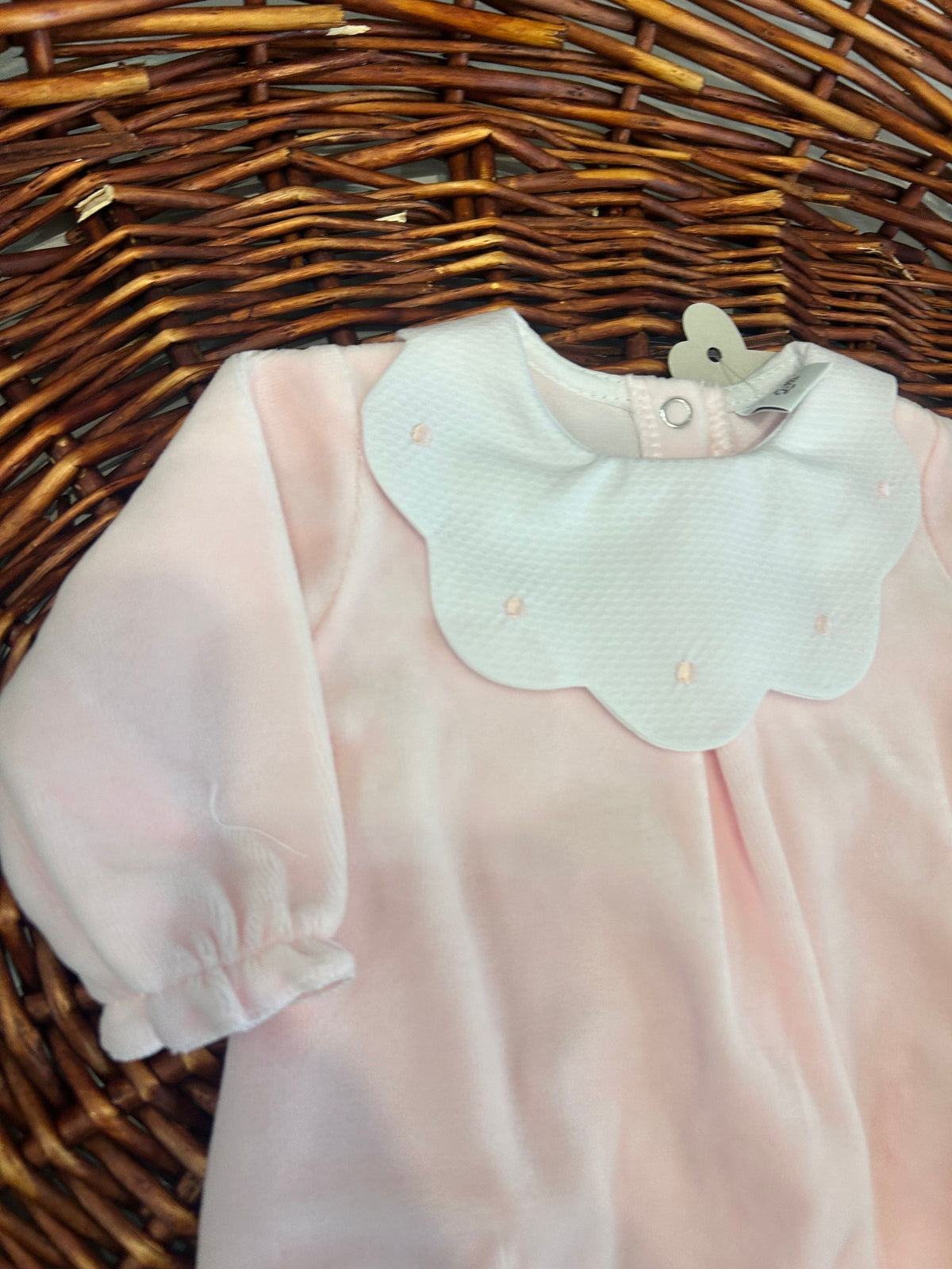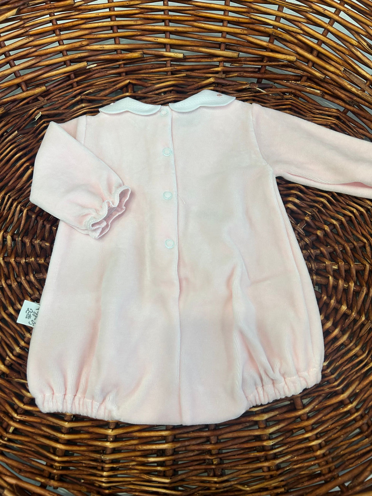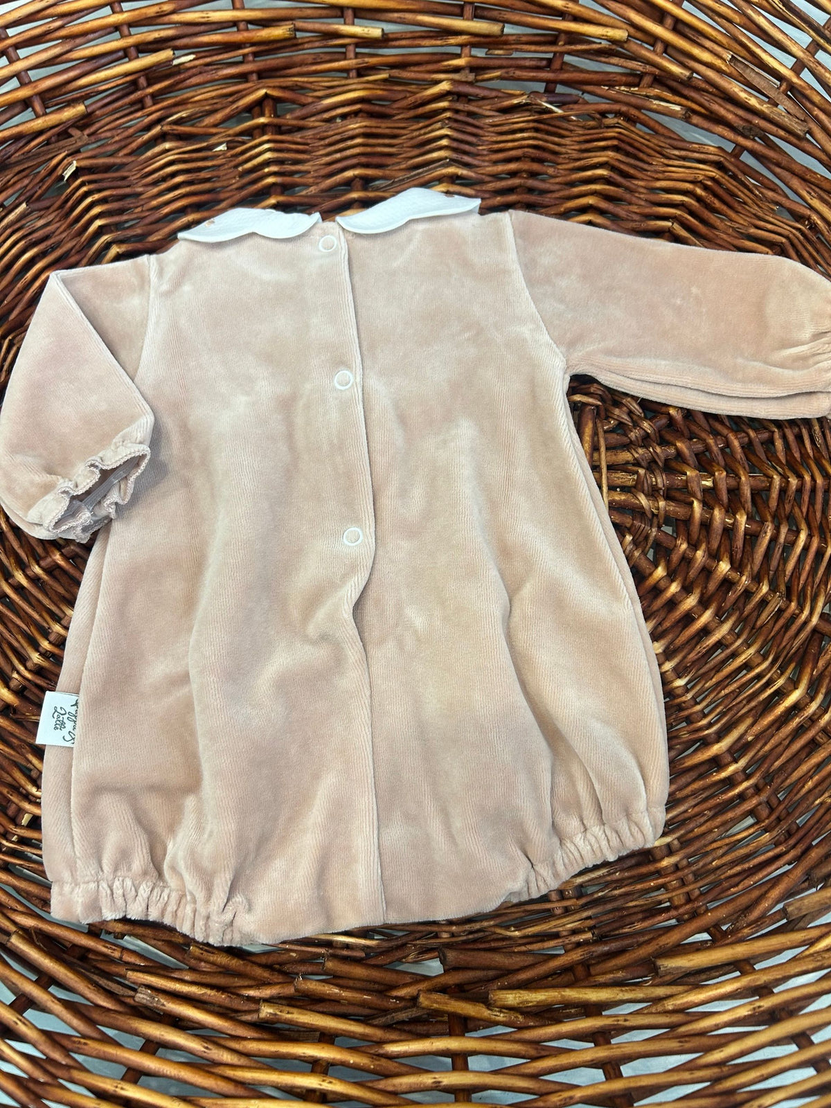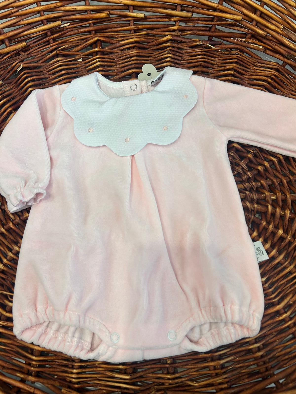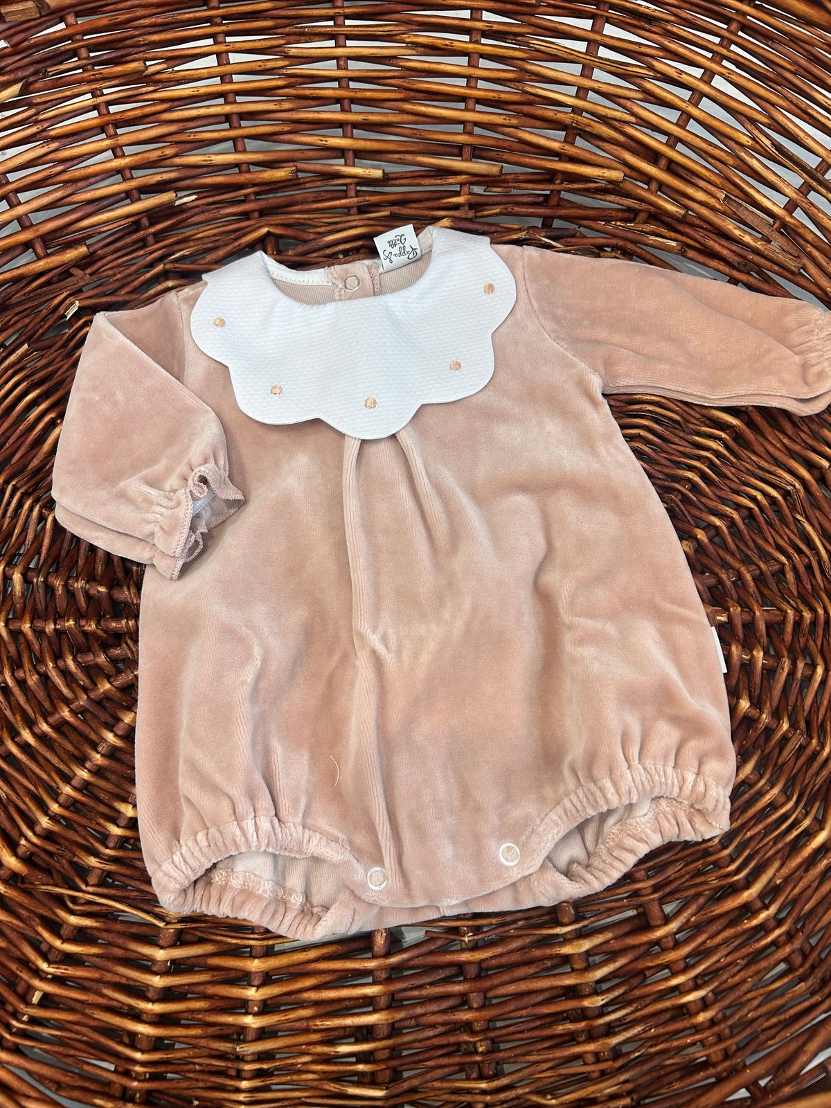 pagliaccetto in calda e morbida ciniglia con ciappe dietro e al cavallo ,con collo in piquet a onde ,perfetta per i primi cambi