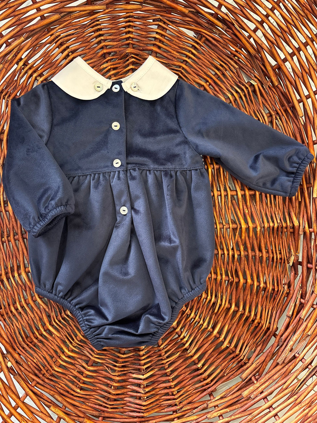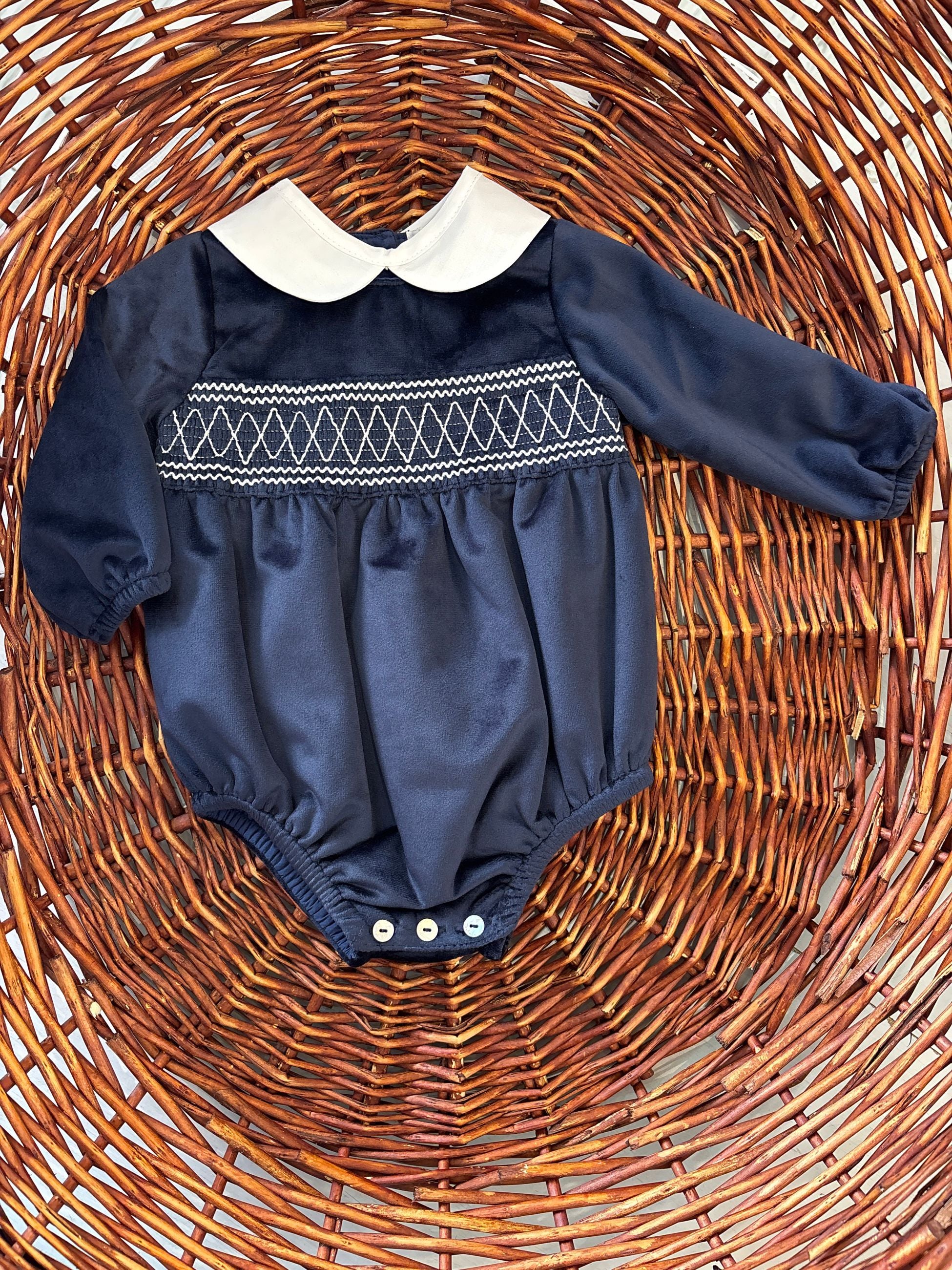 pagliaccetto di velluto liscio con collo camicia tondo e ricamo effetto punto smoke ,il capo porta bottoni al retro in medreperla e al fondo per permettere il cambio del pannolino