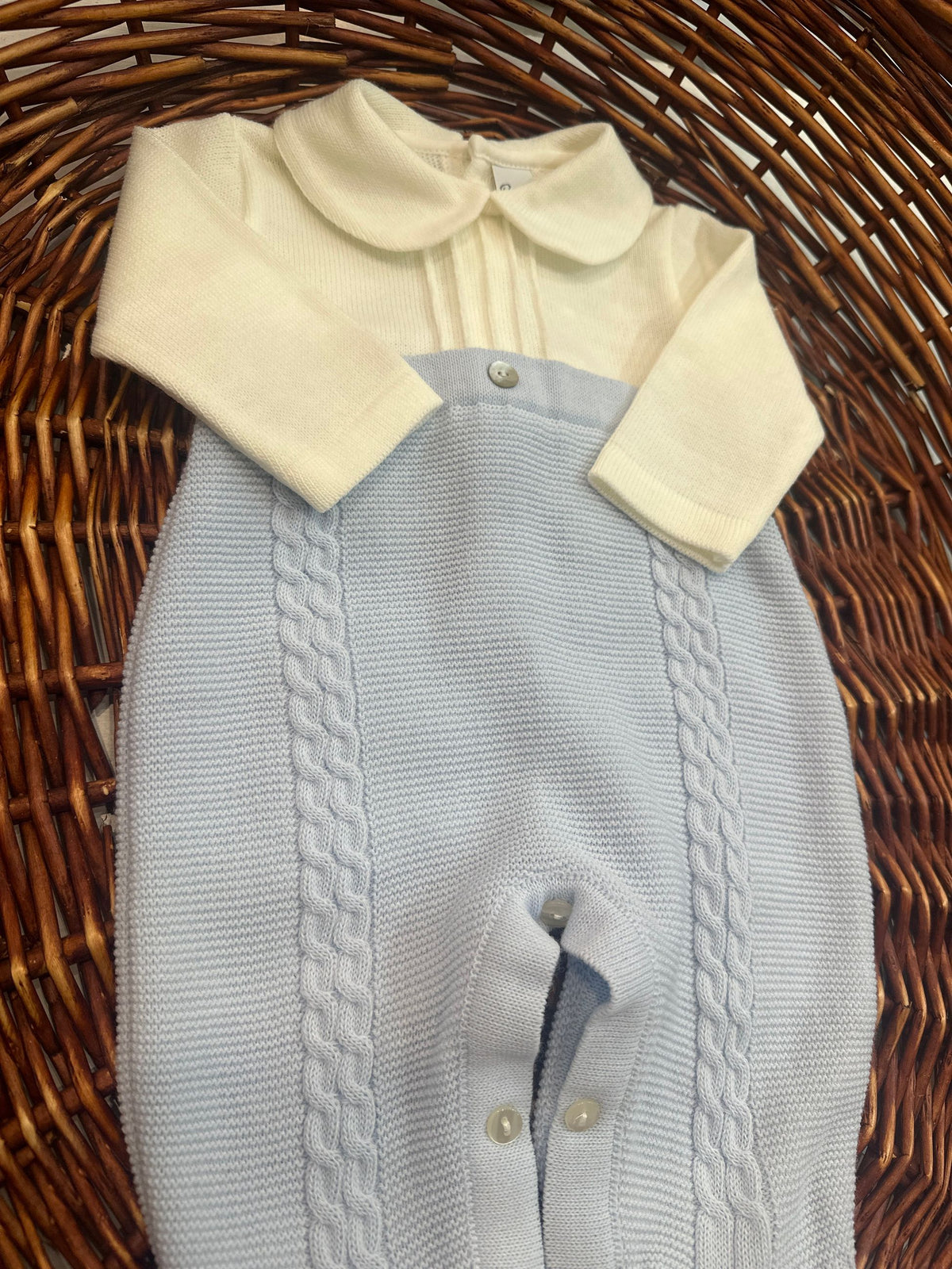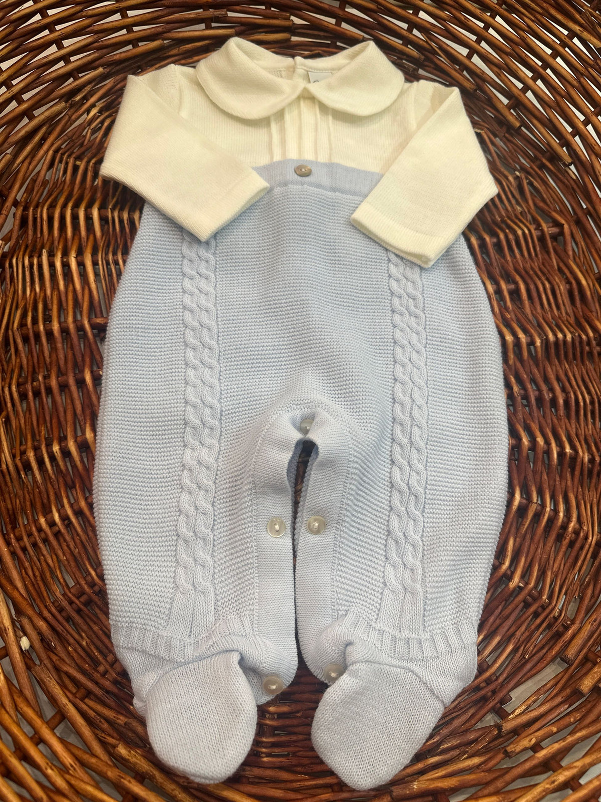 tutina in calda e morbida lana bicolore lavorata a trecce con bottoni in madreperla e colletto,l'apertura fino al fondo risulta comoda