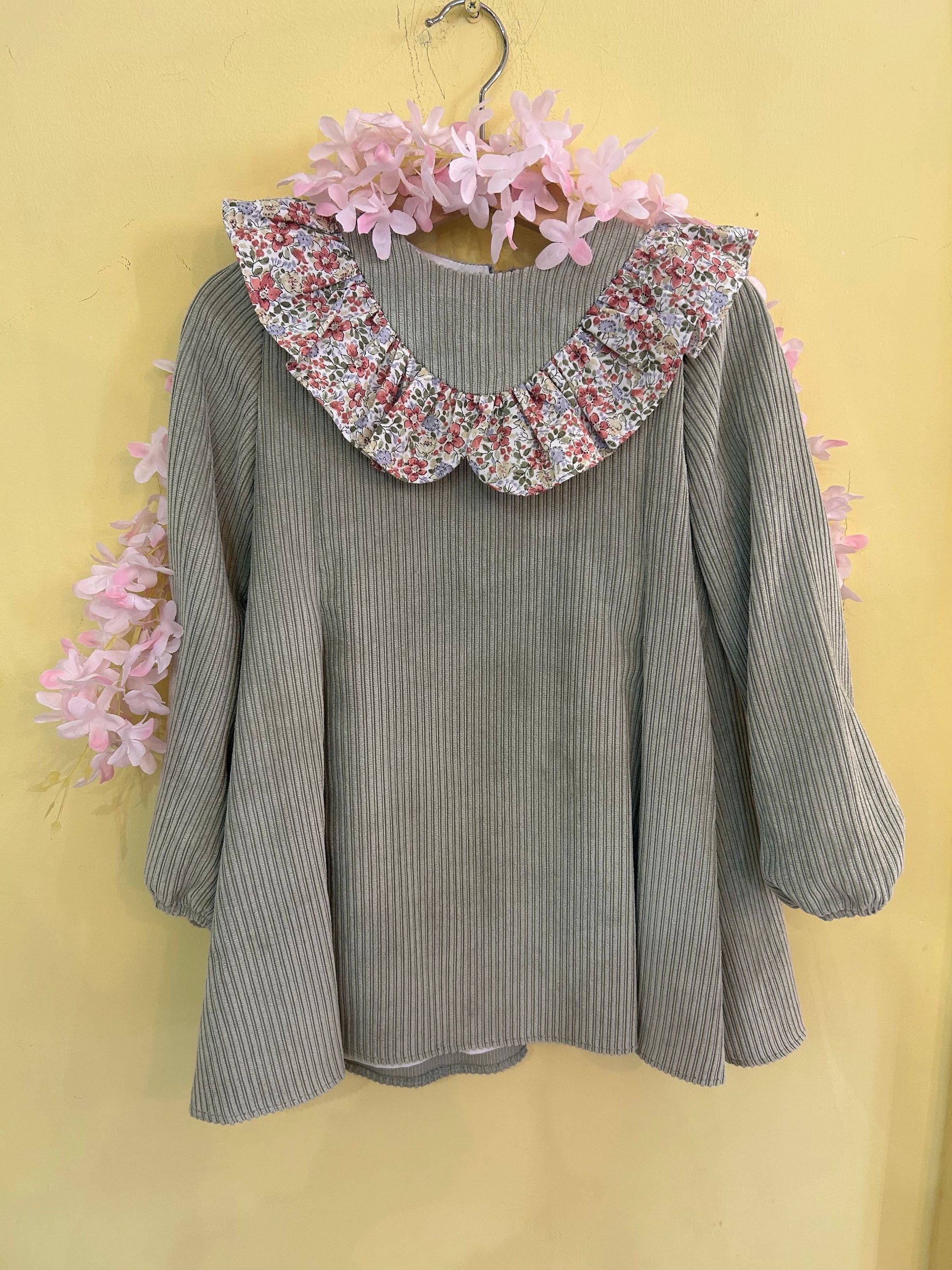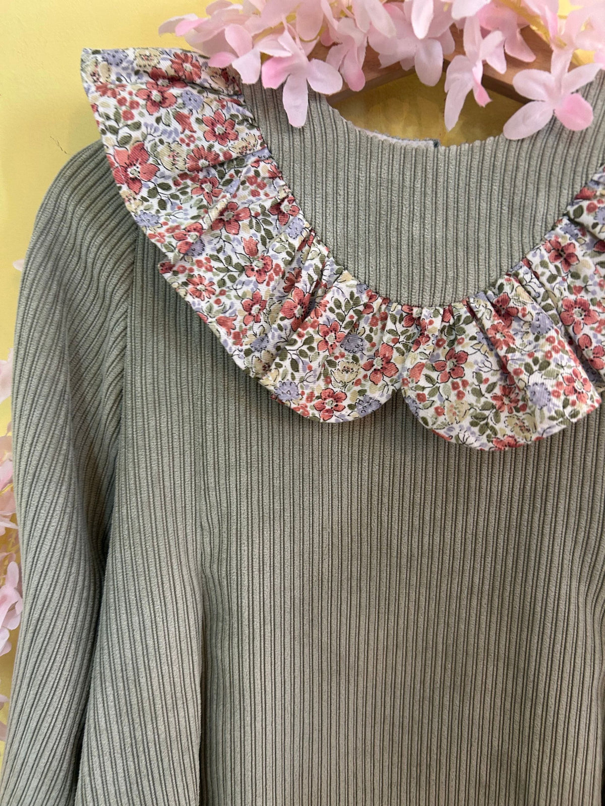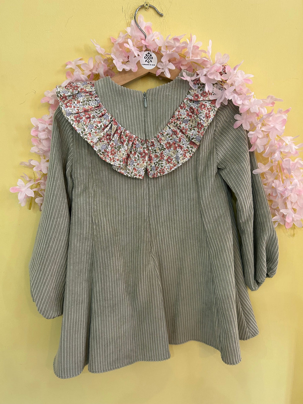 abito in velluto a costine girocollo  con applicazione rouches  tessuto liberty