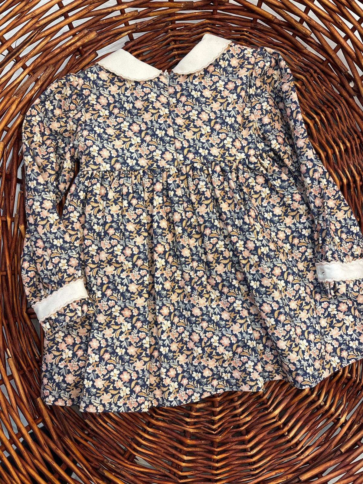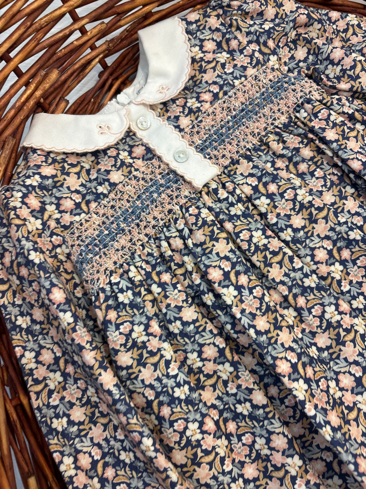 abito in tessuto caldo cotone fantasia liberty con effetto ricamo punto smoke e zip al retro,l abito porta un colletto a contrasto