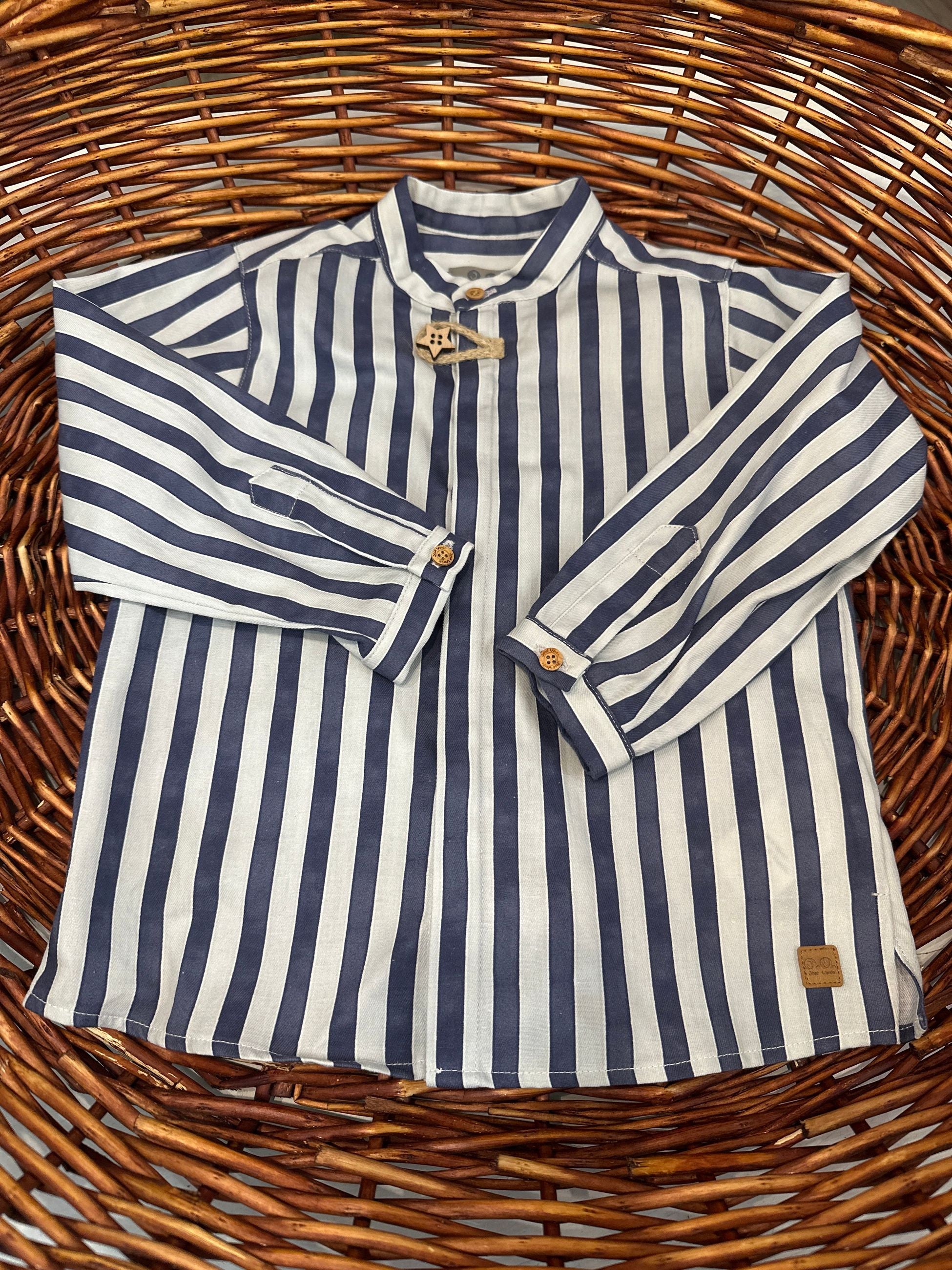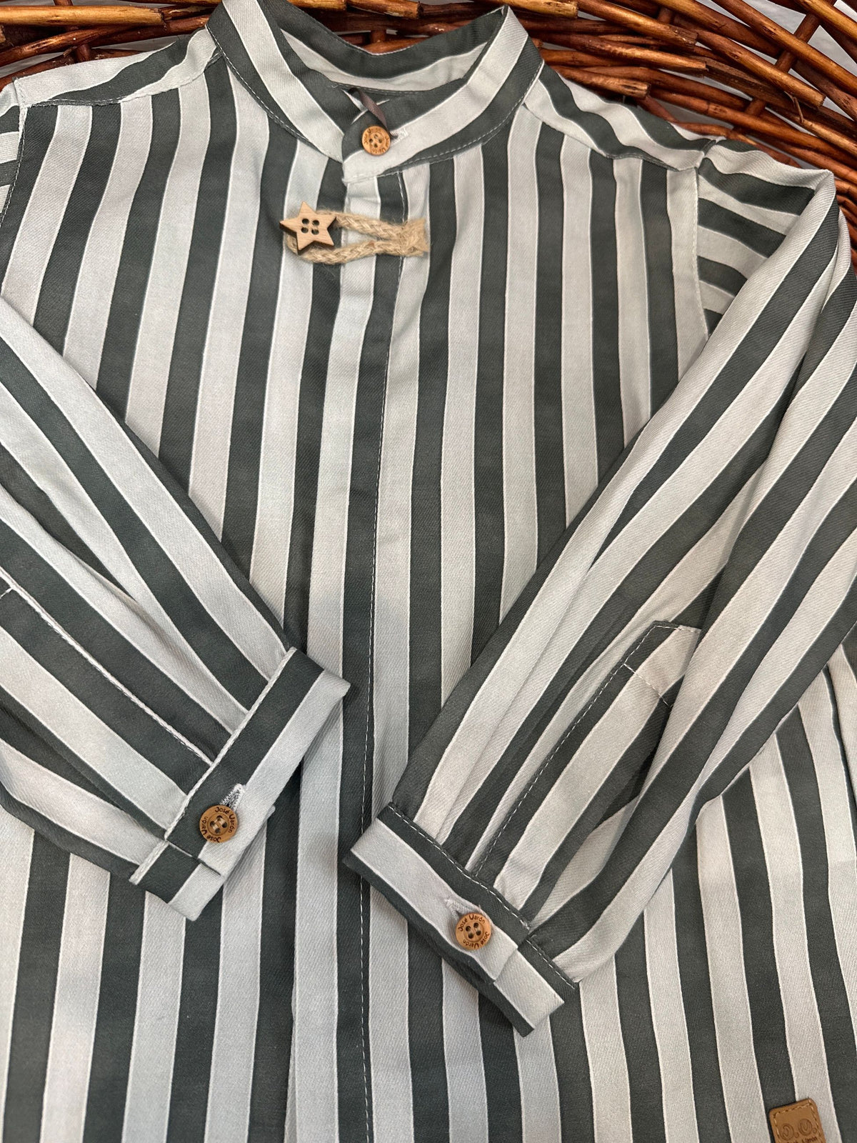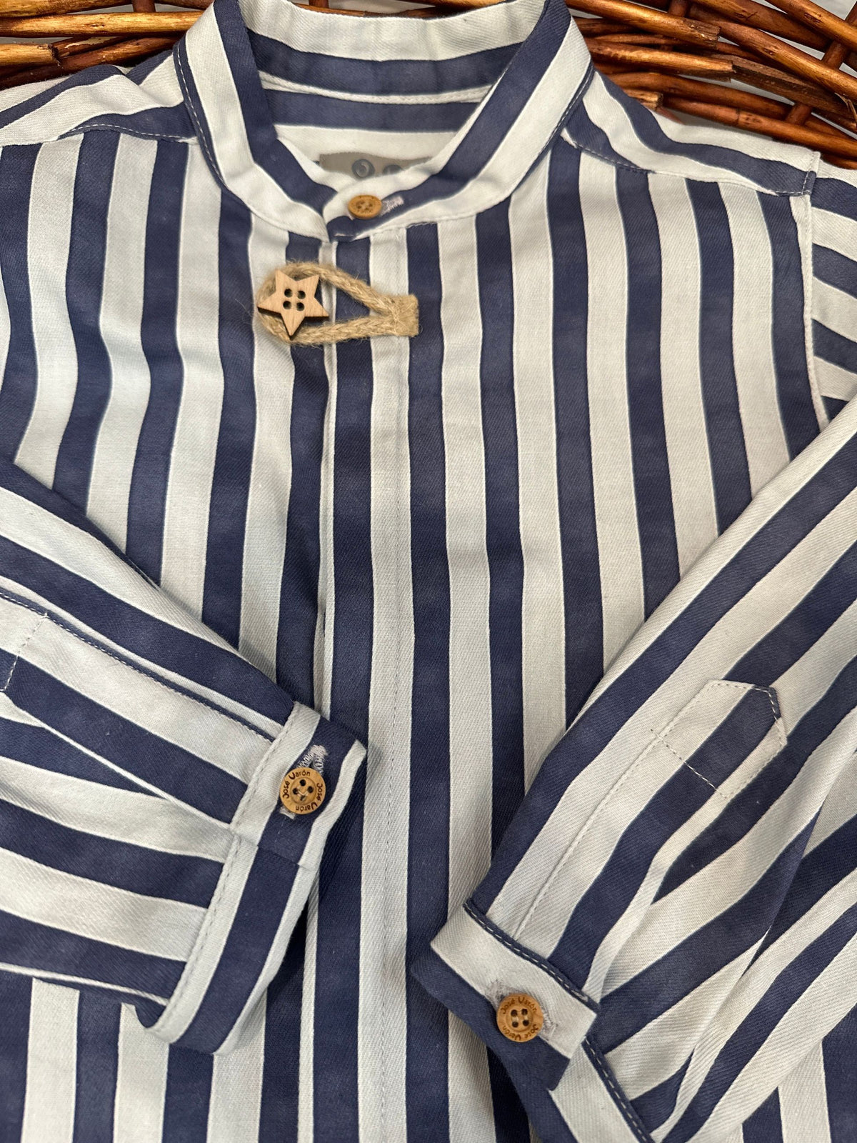 camicia in cotone fantasia a righe con collo coreano e manica lunga.la camicia porta l'abbottonatura a scomparsa sul davanti e i bottoni in legno,uno avanti a forma di stella che si chiude con alamaro in corda,è una camicia casual chic