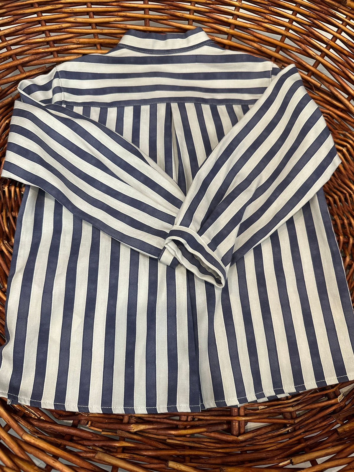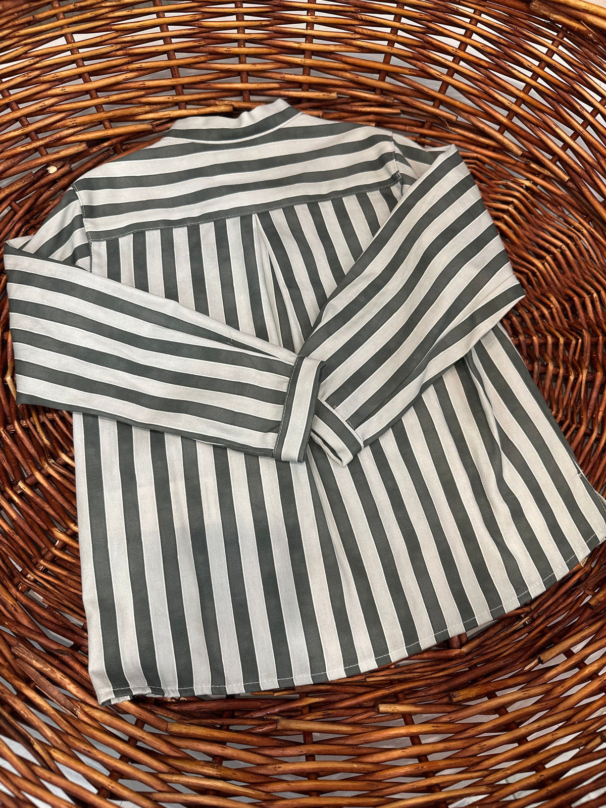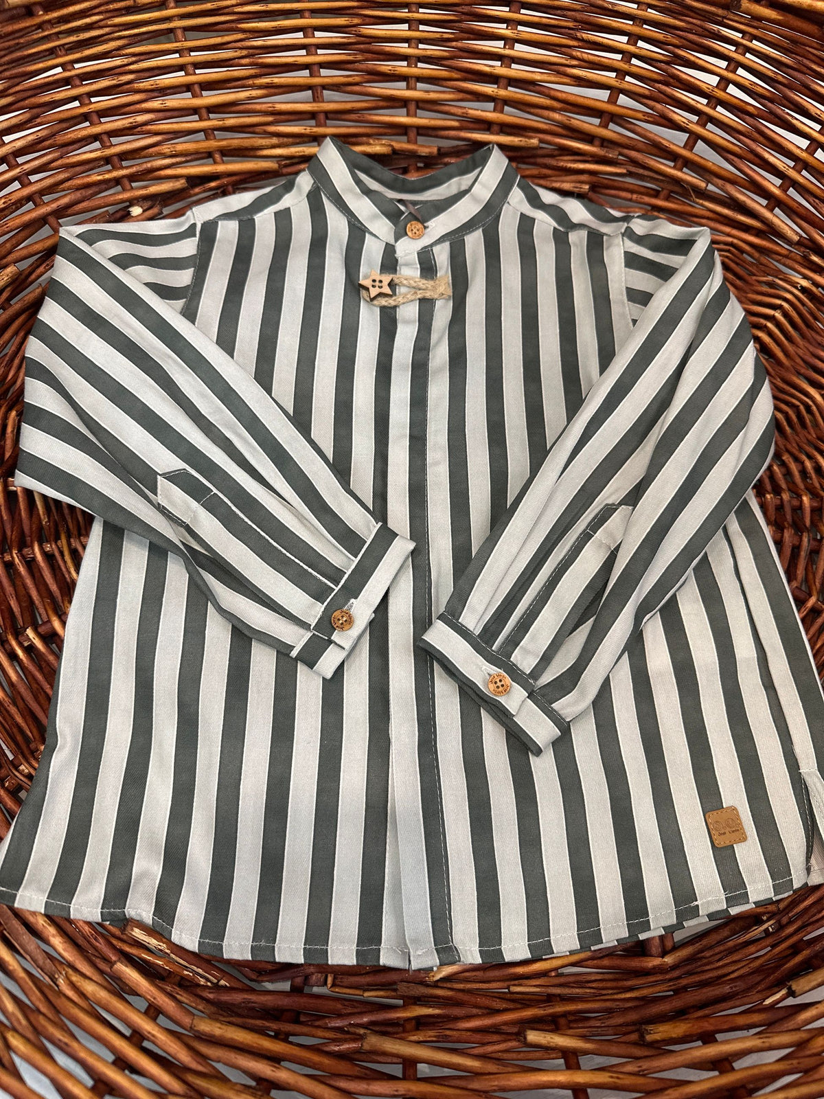 camicia in cotone fantasia a righe con collo coreano e manica lunga.la camicia porta l'abbottonatura a scomparsa sul davanti e i bottoni in legno,uno avanti a forma di stella che si chiude con alamaro in corda,è una camicia casual chic