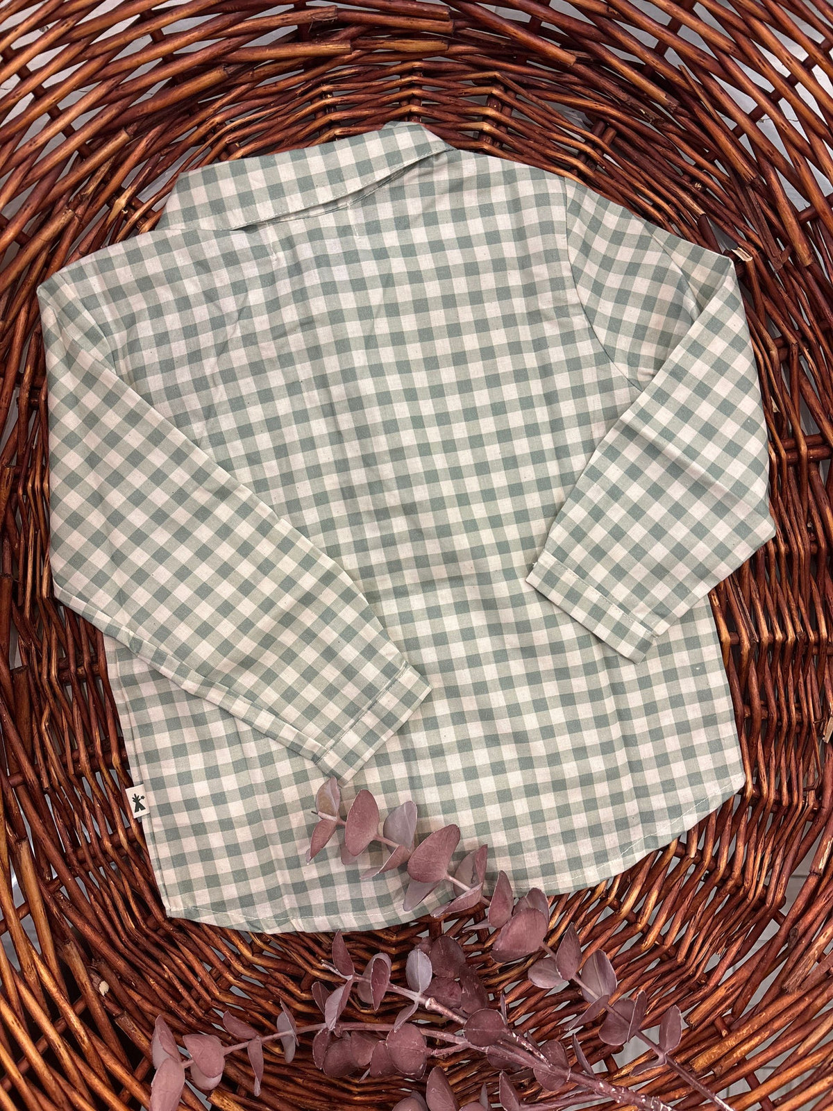 camicia in cotone fantasia vichy con collo a punta e bottoni in legno