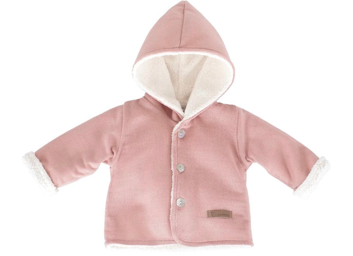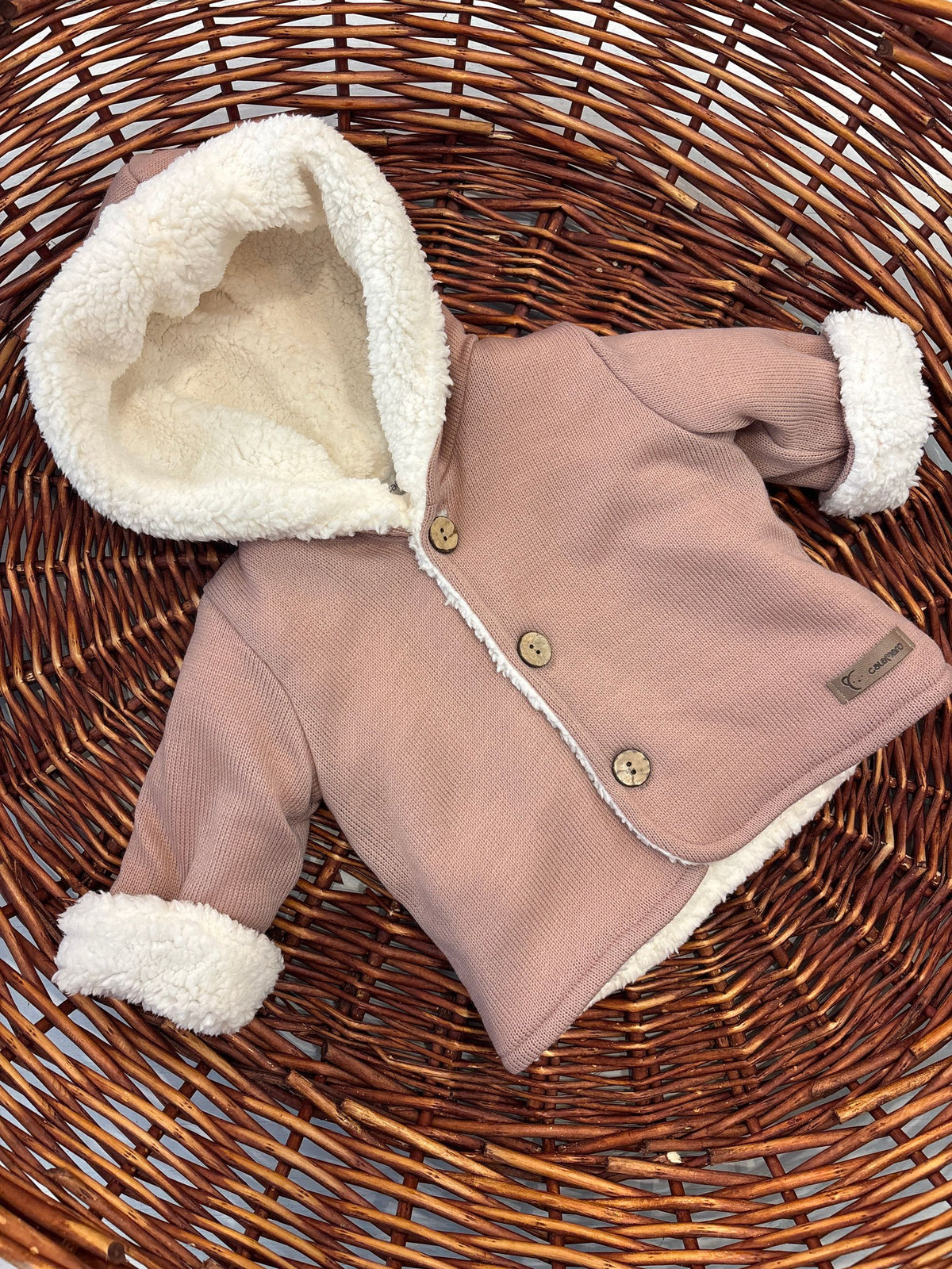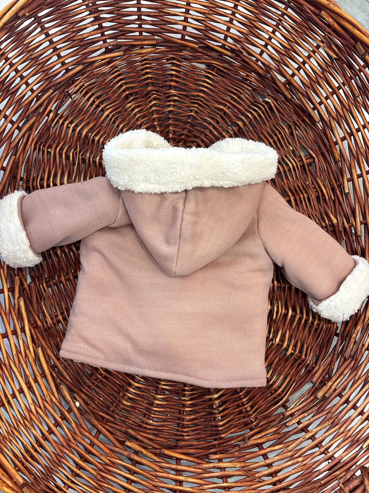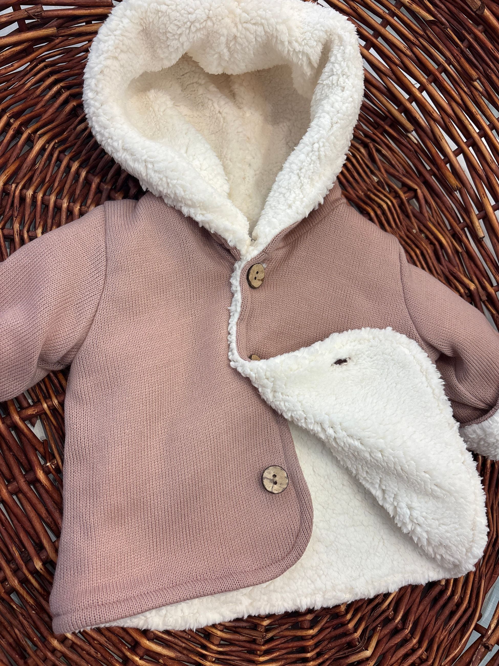 cappotto in maglia con interno in pelliccia effetto pecora,morbido e avvolgente sin dai primi mesi,il cappotto porta bottoni in legno e un comodo cappuccio