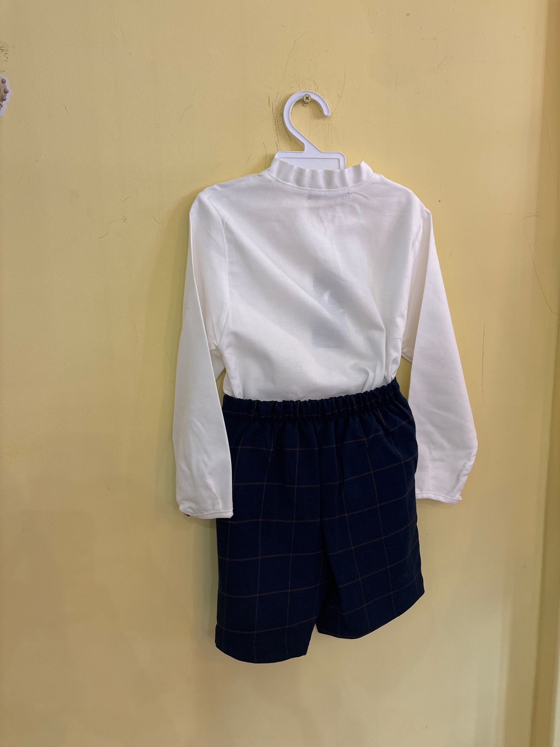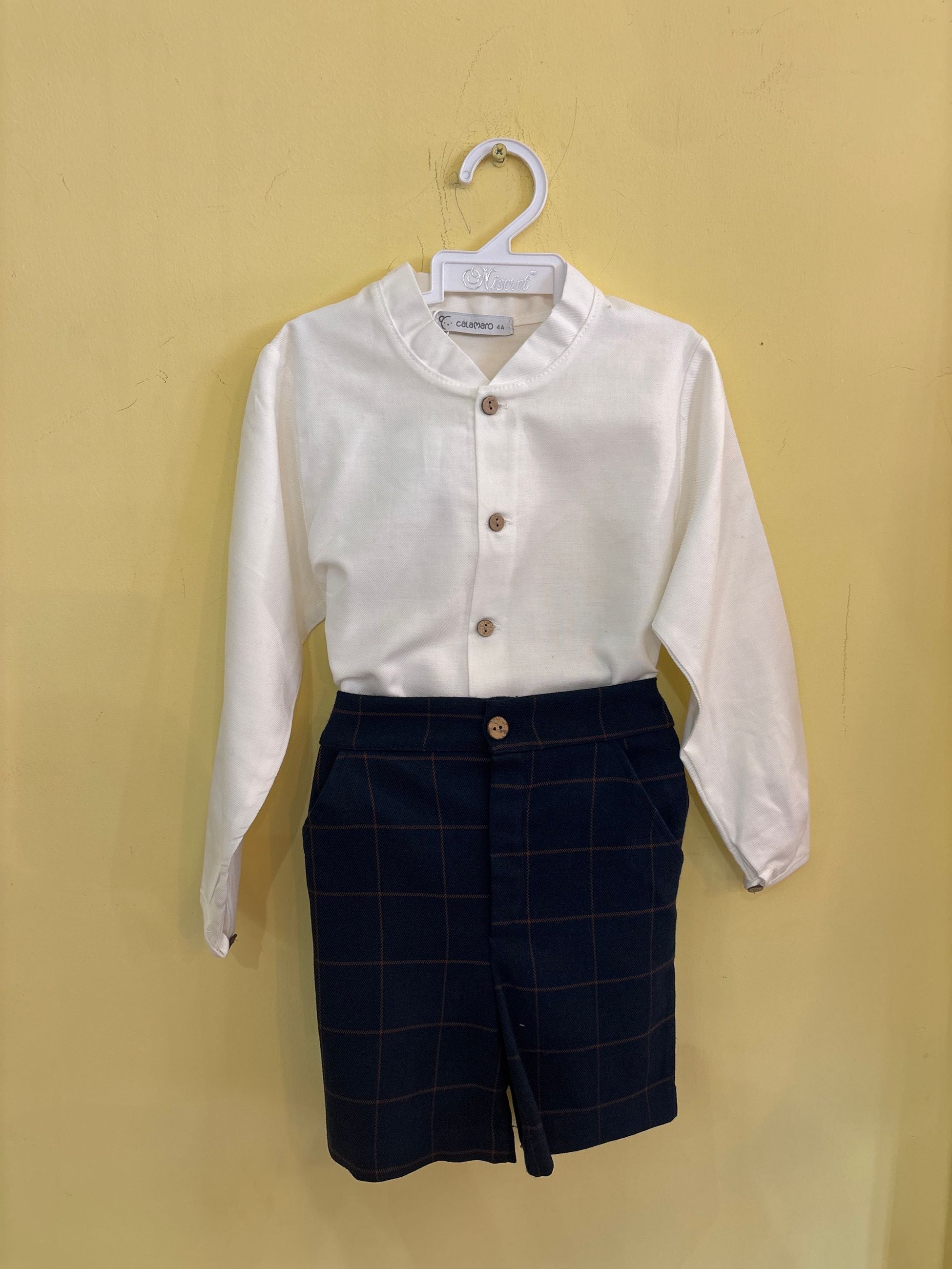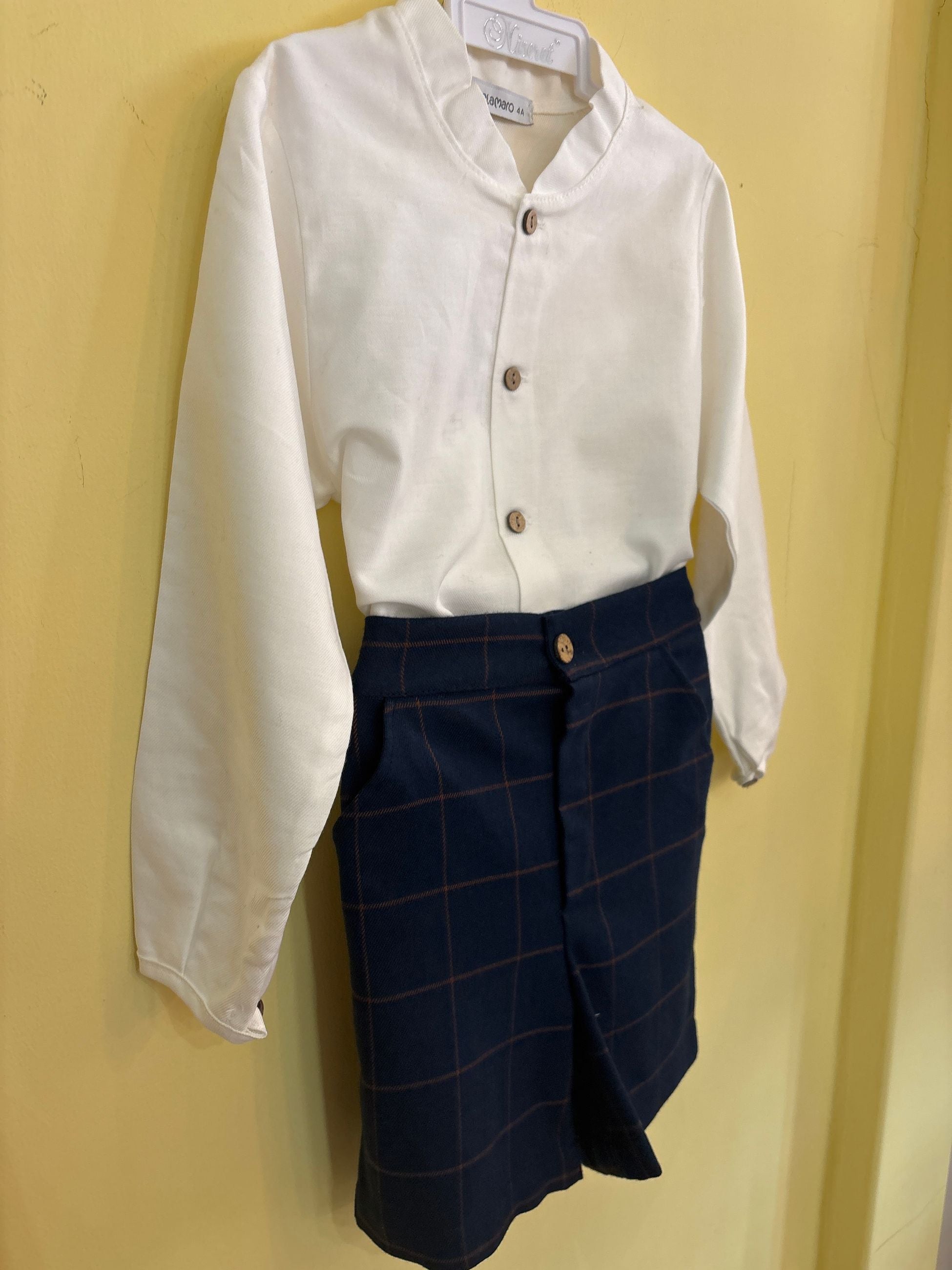 completo con camicia con collo coreano e bottoncini in legno e bermuda stile inglese fondo blu con quadri marroni