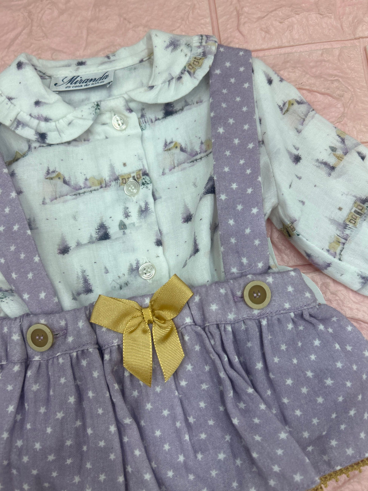 completo con camicia collo tondo e salopette con coulotte effetto gonna