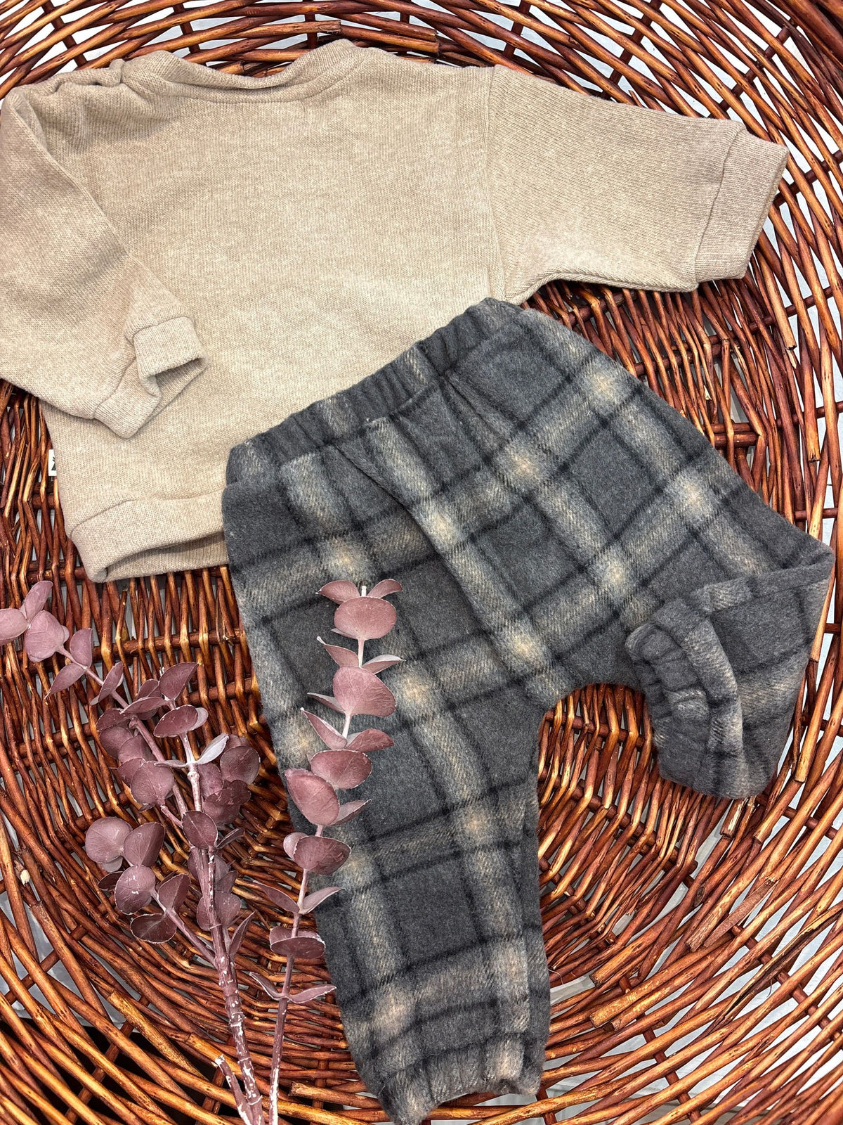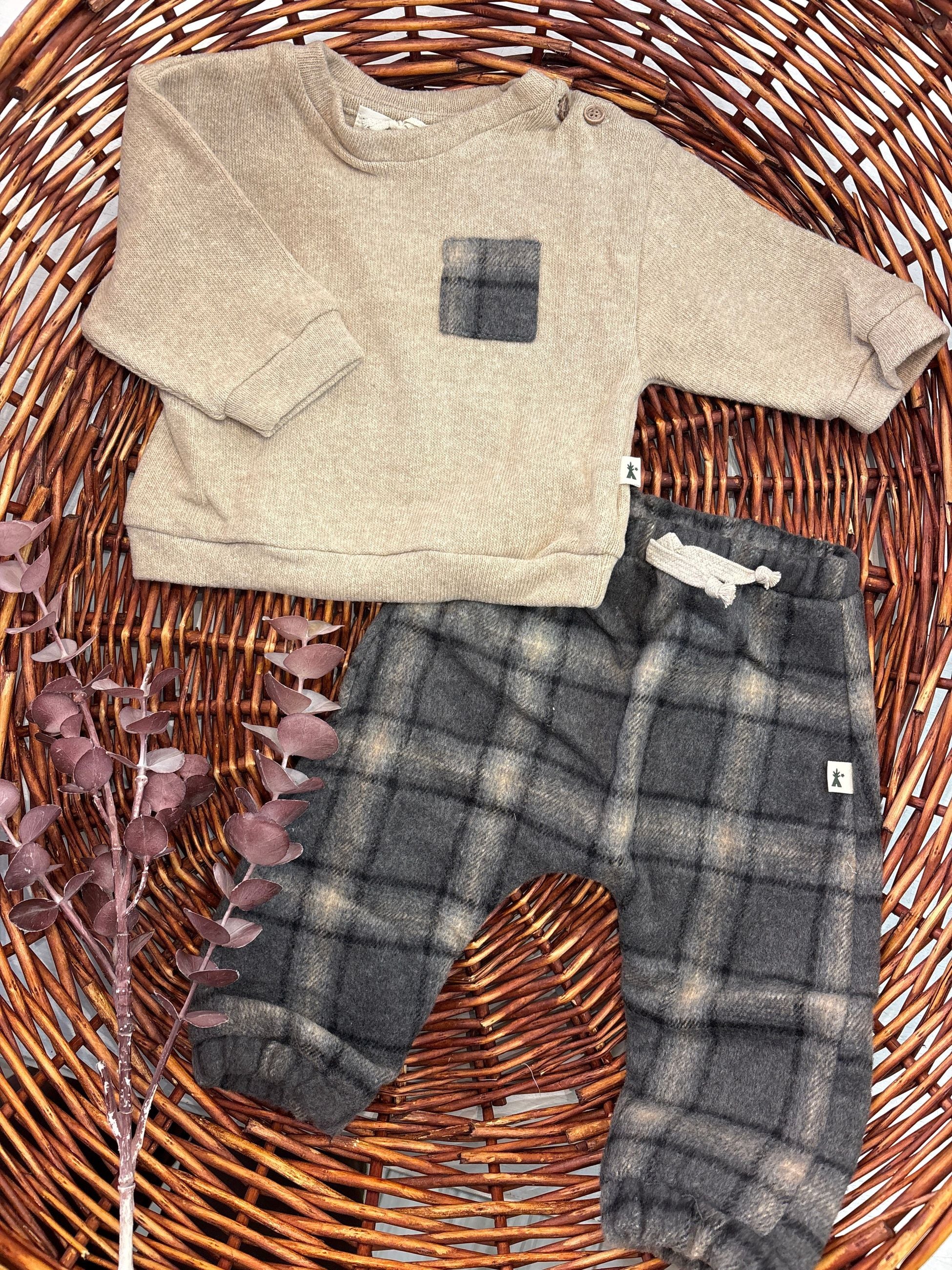 completo in caldo cotone con maglia girocollo manica lunga con taschino lato cuore,e pantalone in lanetta fantasia pied puol