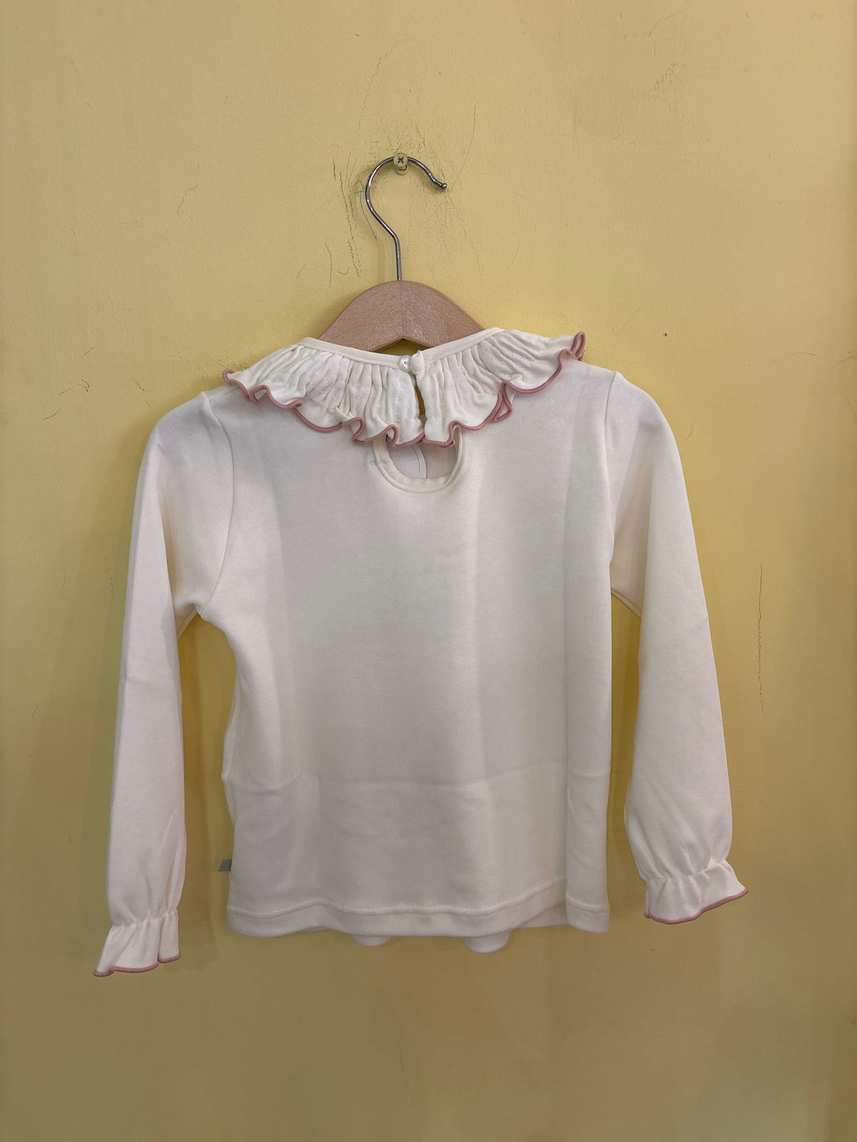 maglia in caldo cotone jersey,con manicalunga e colletto lavorato con piccoli arricci,e orlo a contrasto