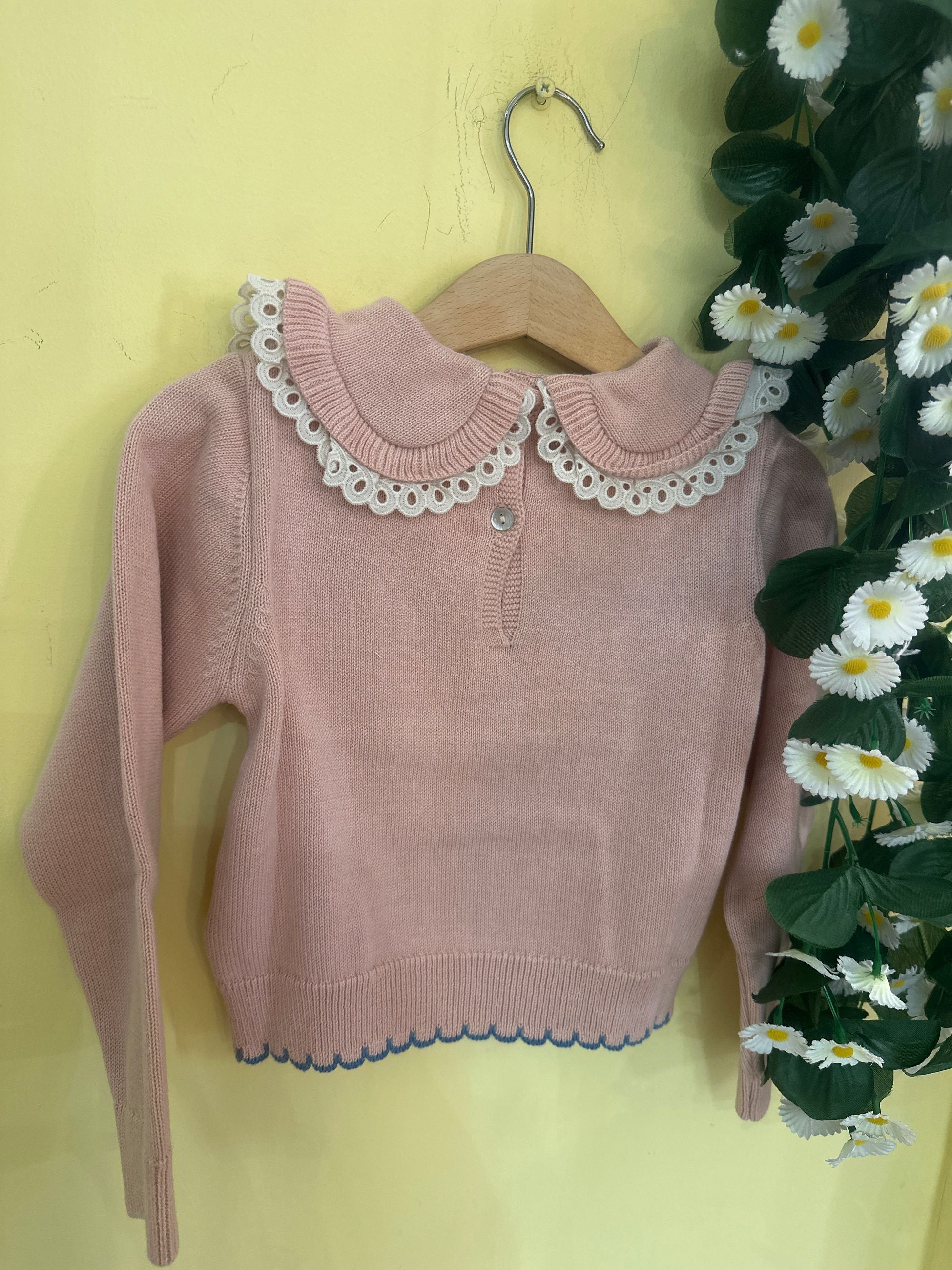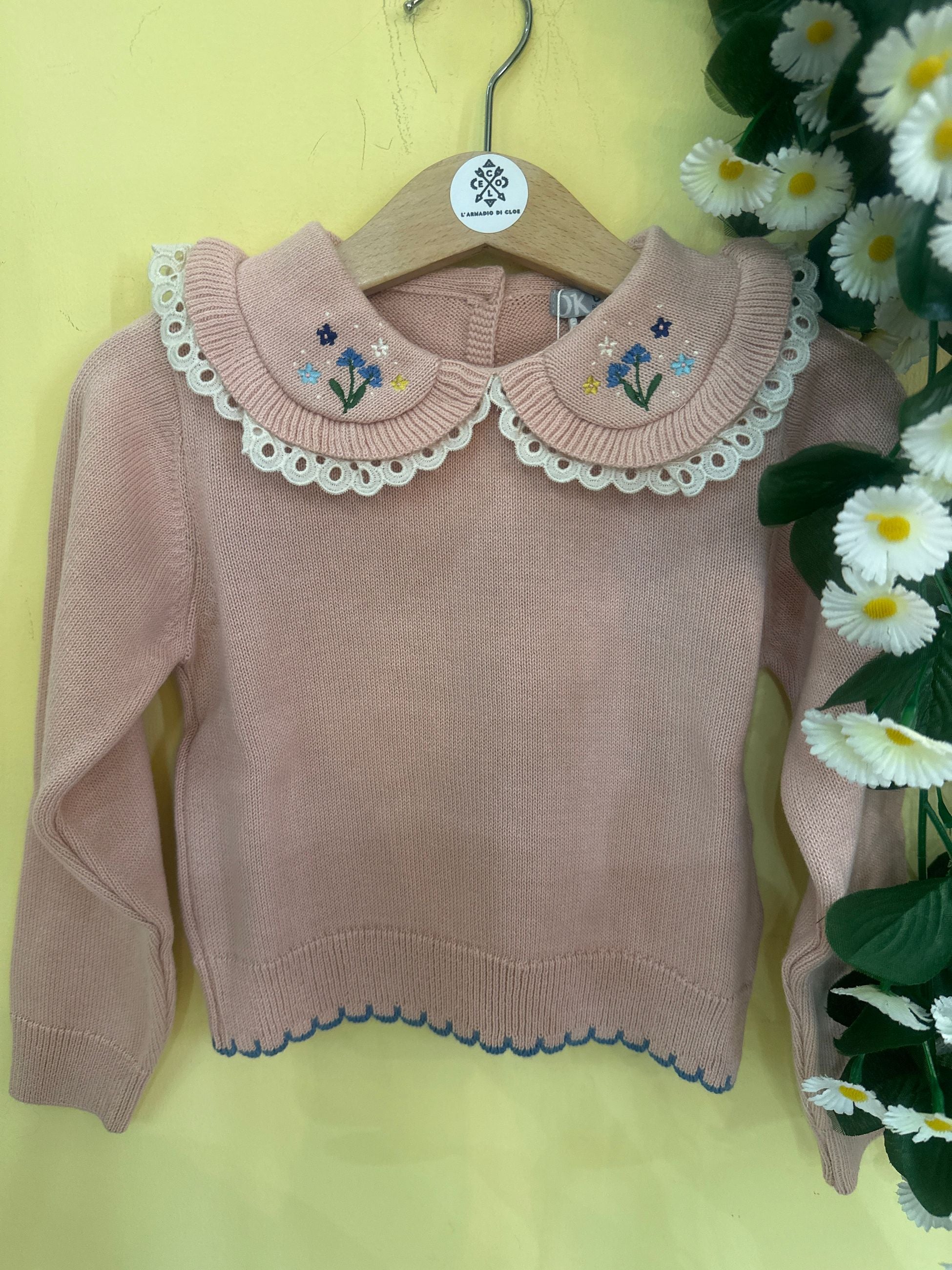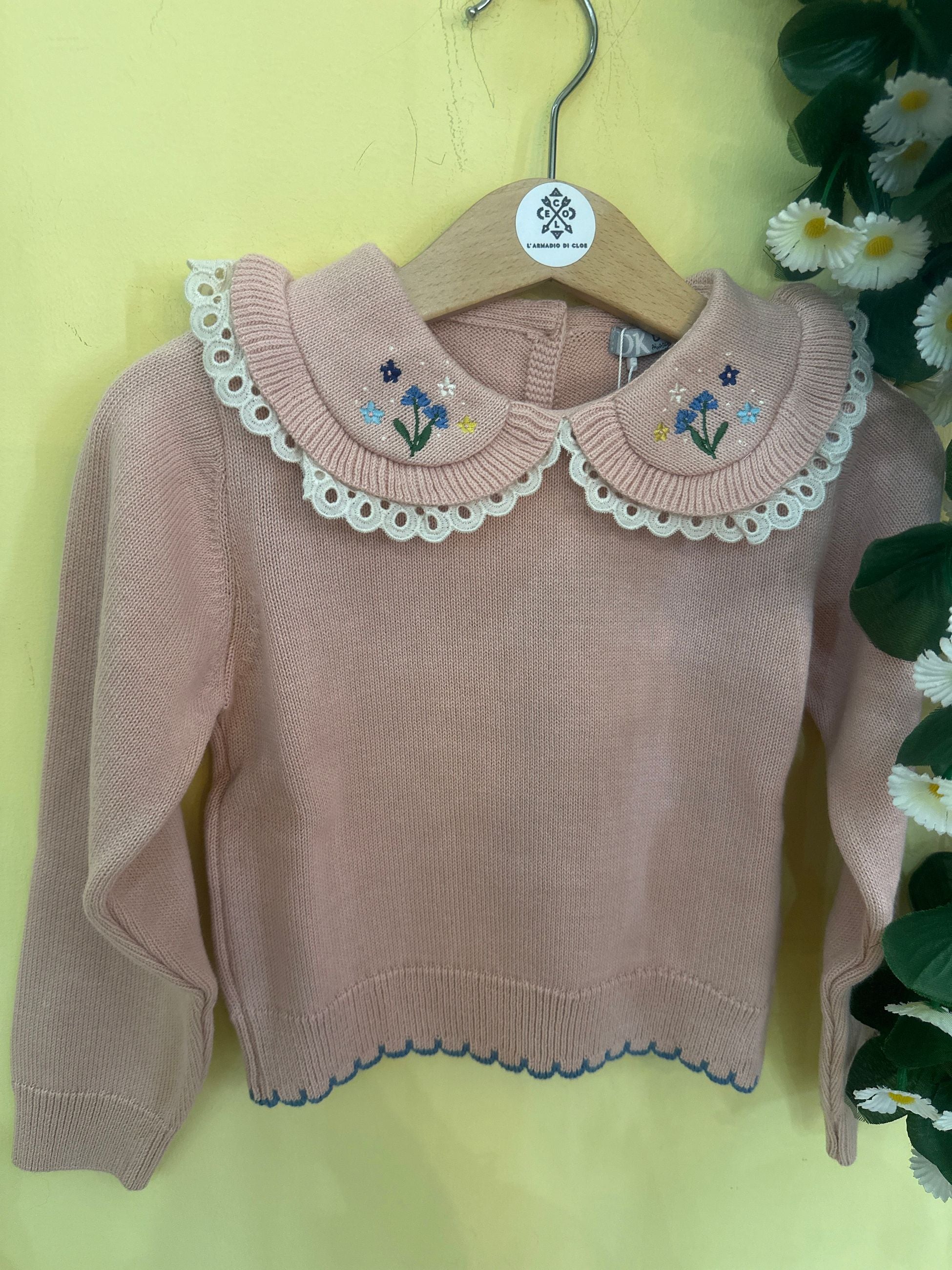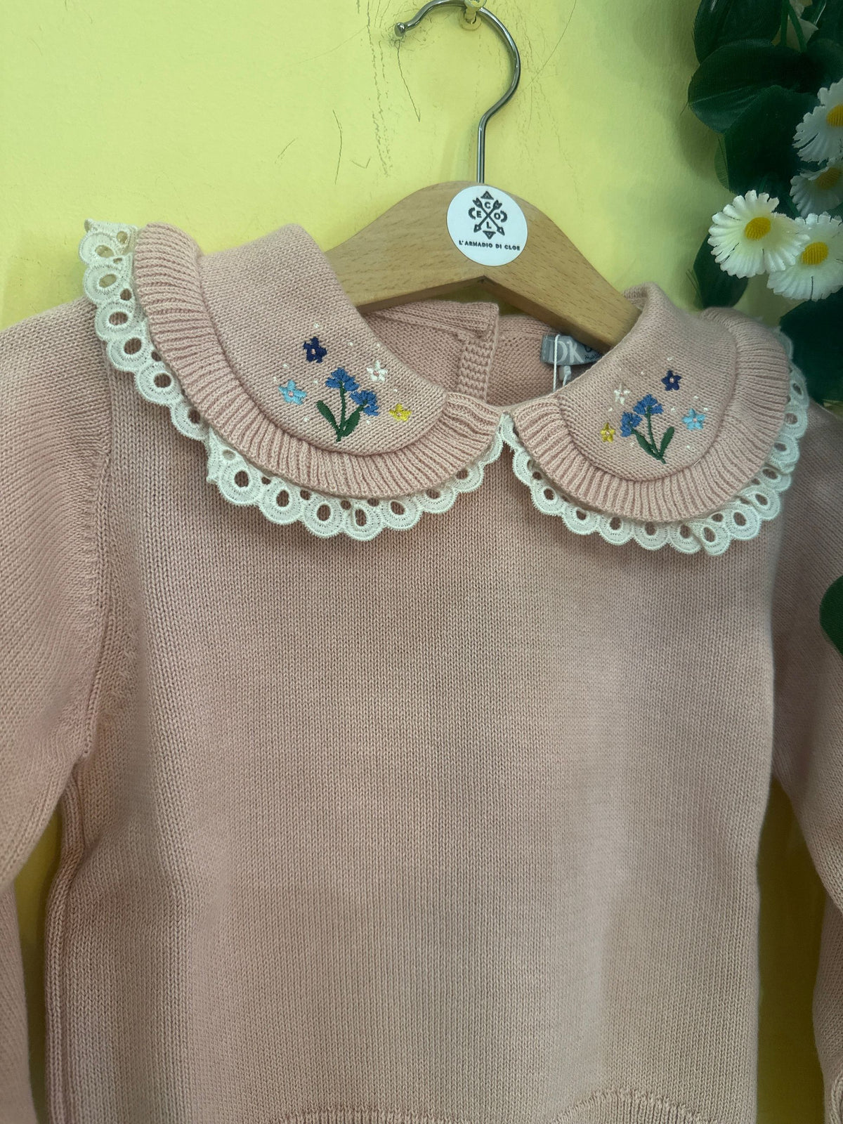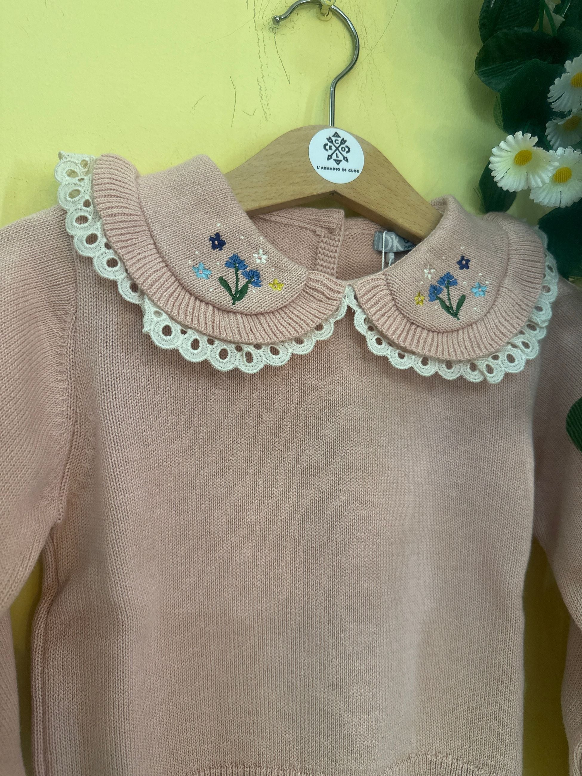 maglia lavorata con profili a contrasto e collo effetto camicia con ricami fiori e orlo in pizzo