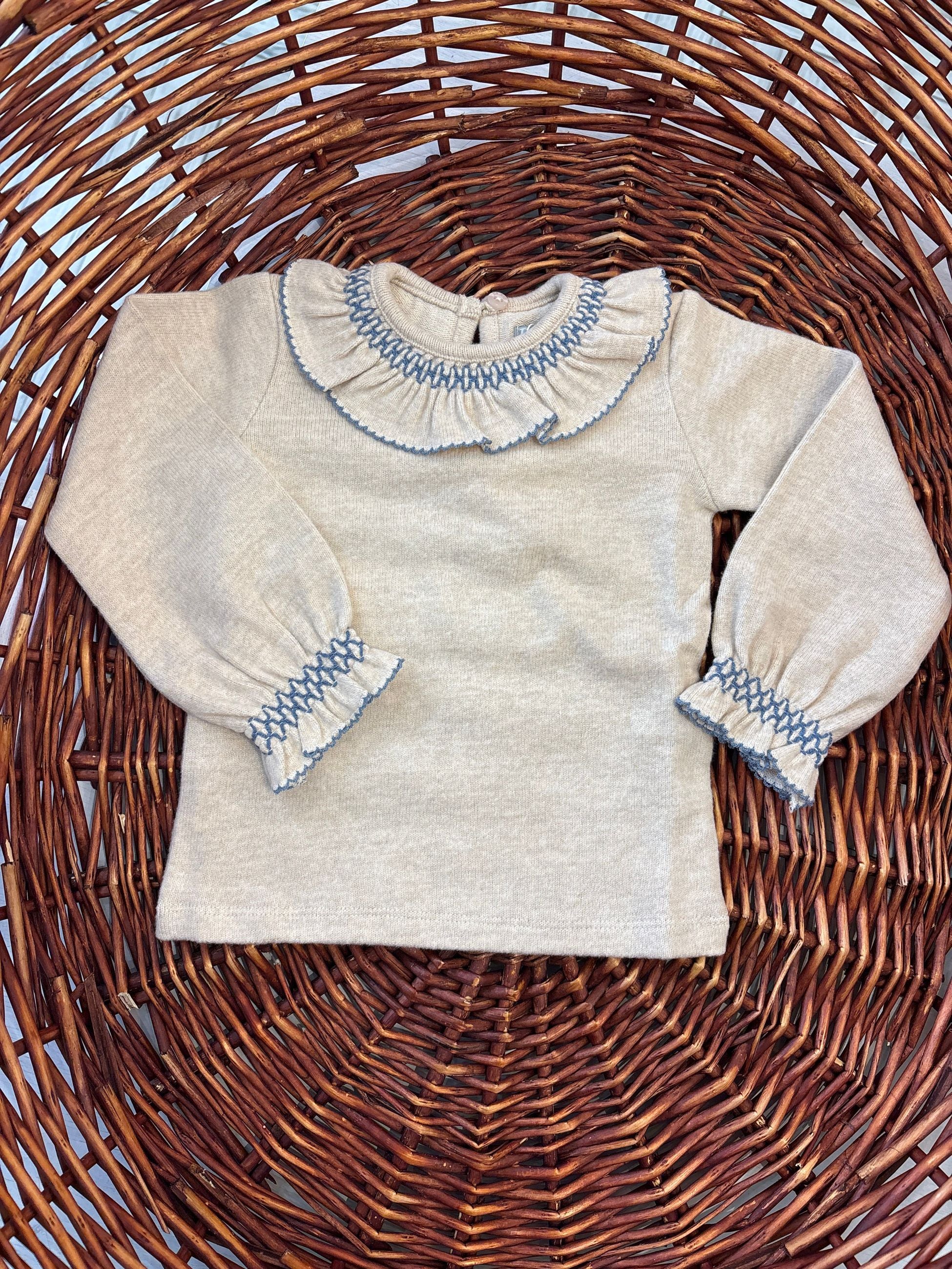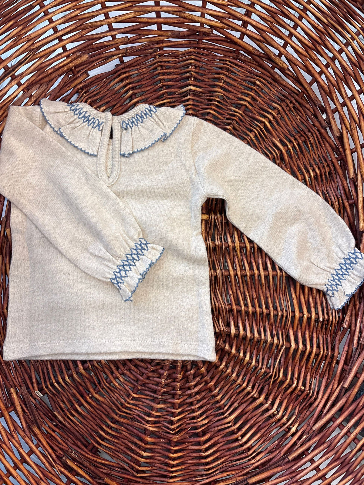 maglia in caldo cotone con collo e manica rouche con richiamo ricamo punto smoke a contrasto