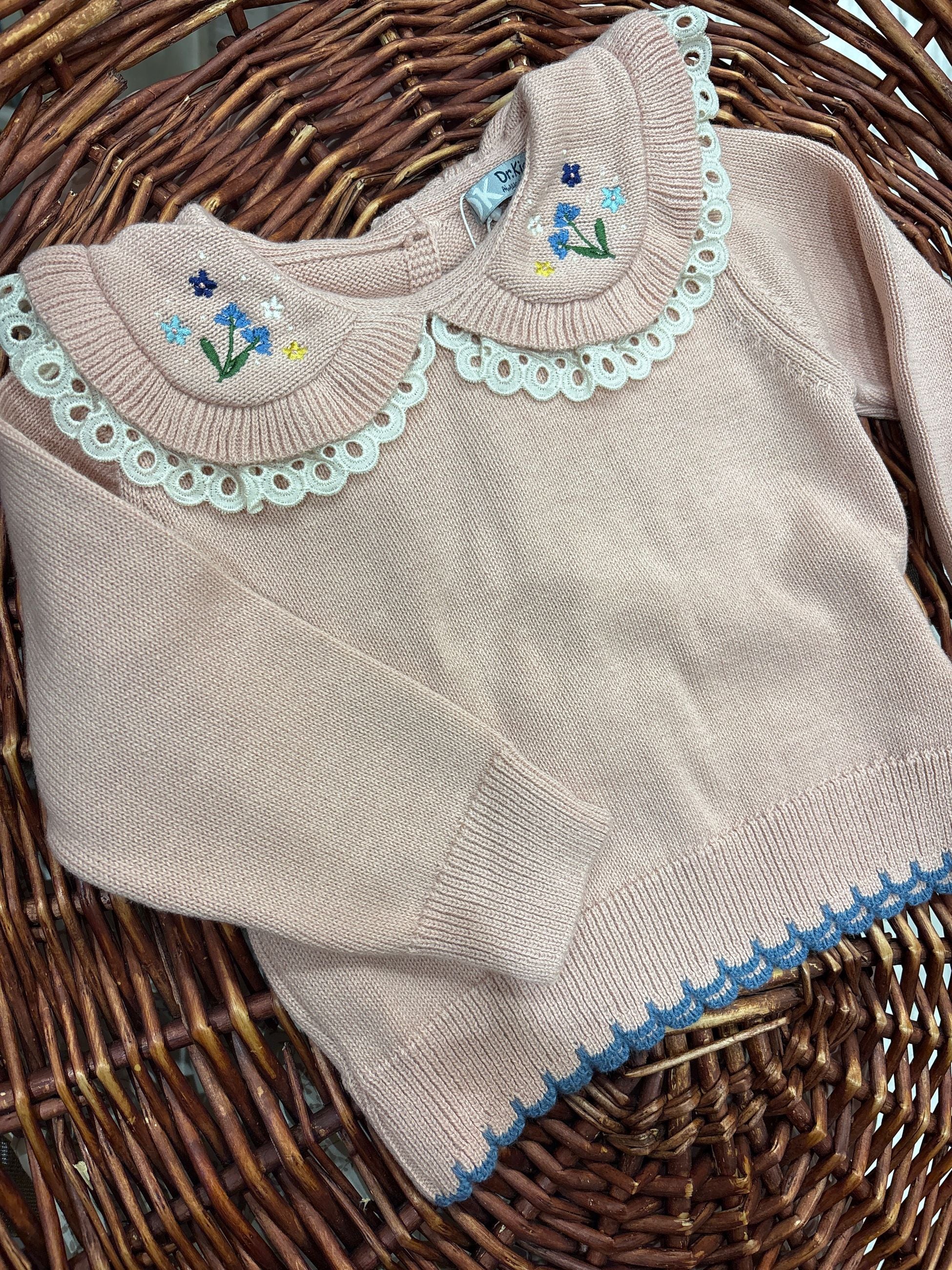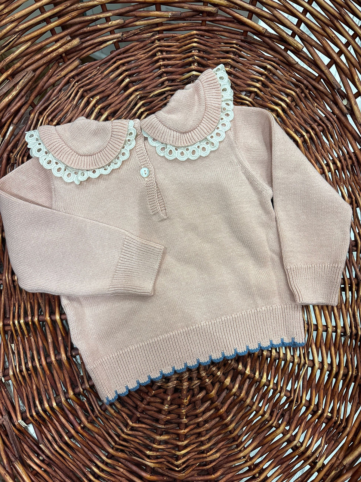 maglia lavorata con profili a contrasto e collo effetto camicia con ricami fiori e orlo in pizzo