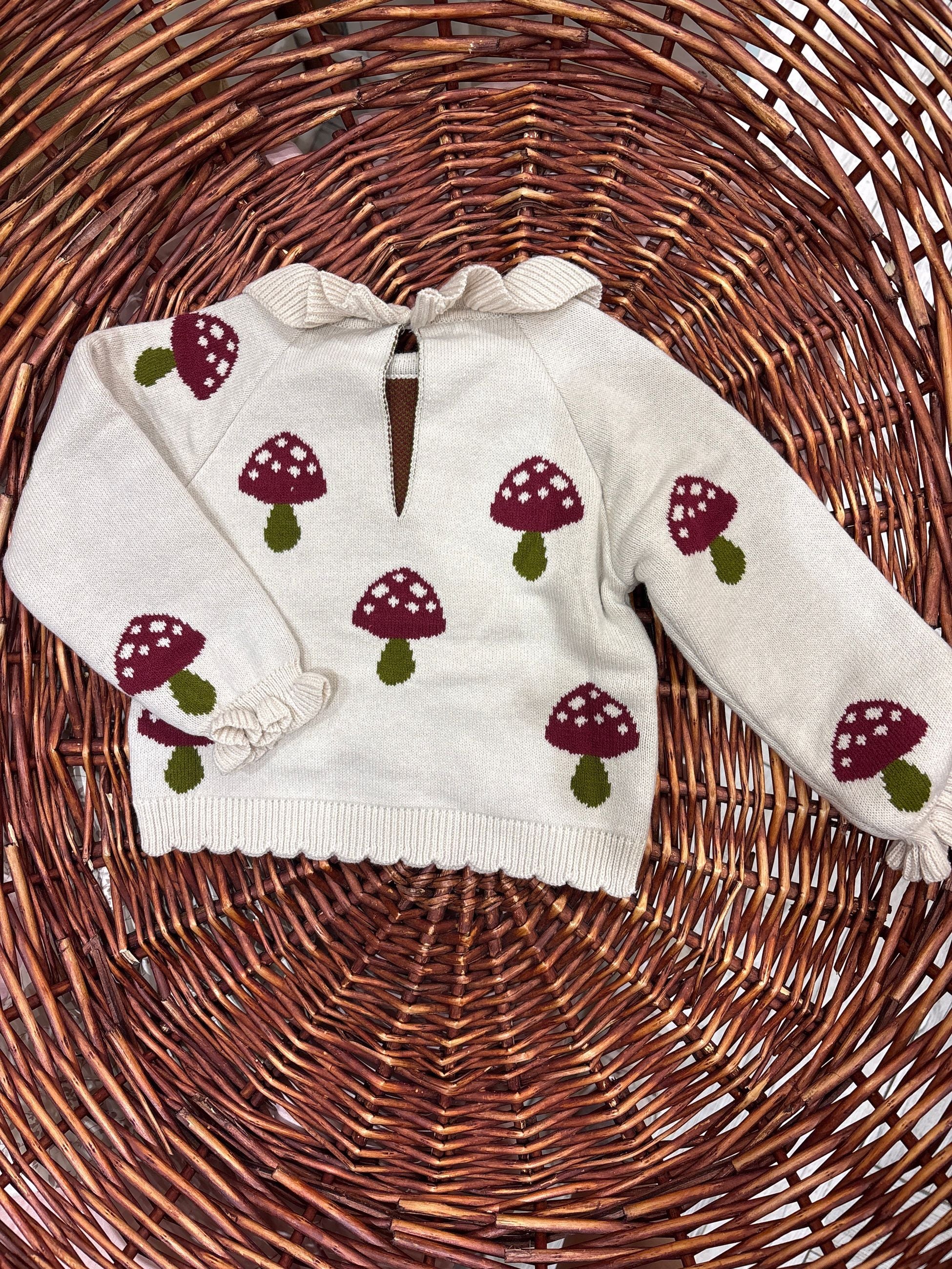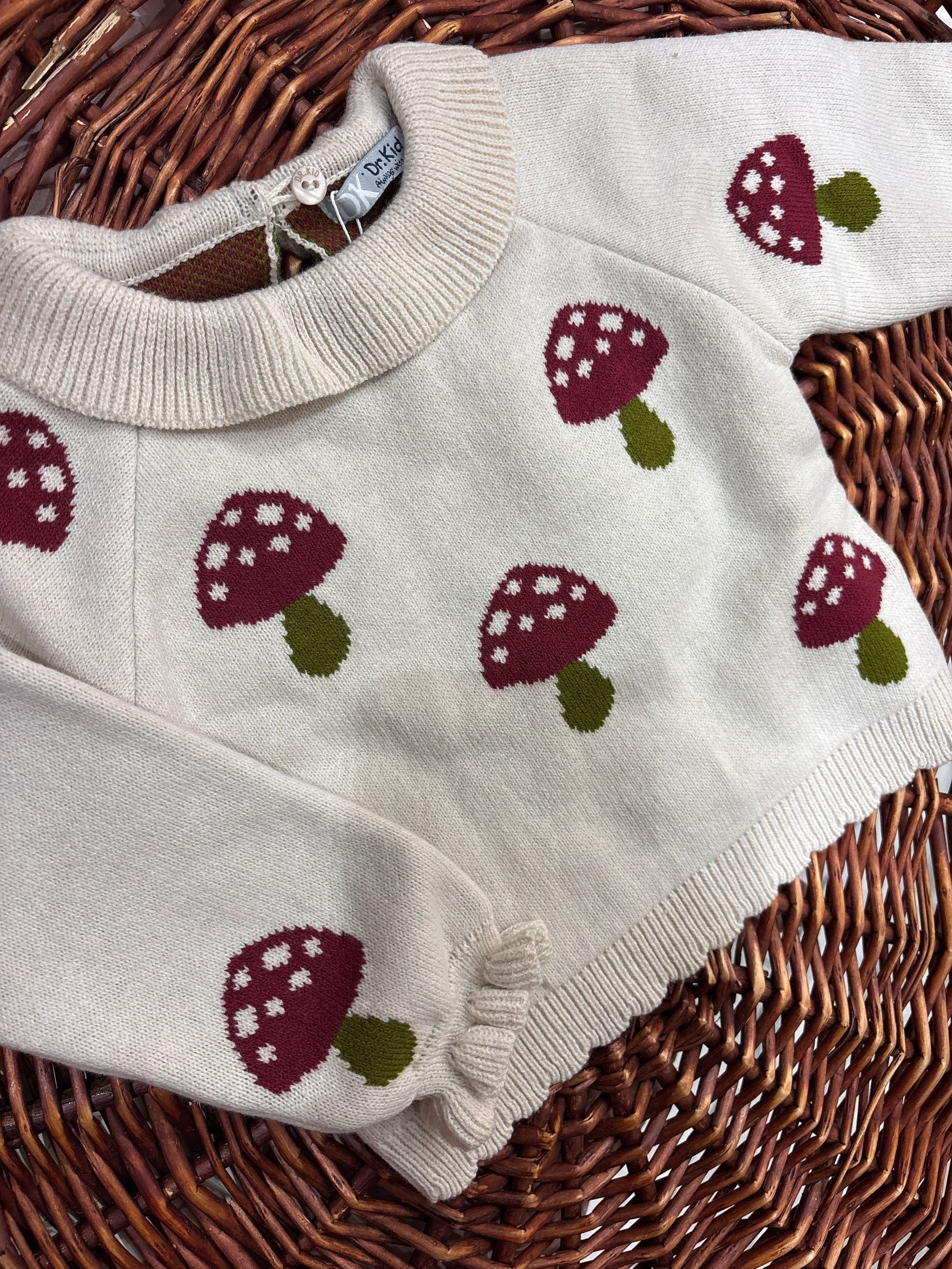 maglia lavorata con intarsi a contrato tema funghi,il colletto e le maniche rouches donano un tocco romantico