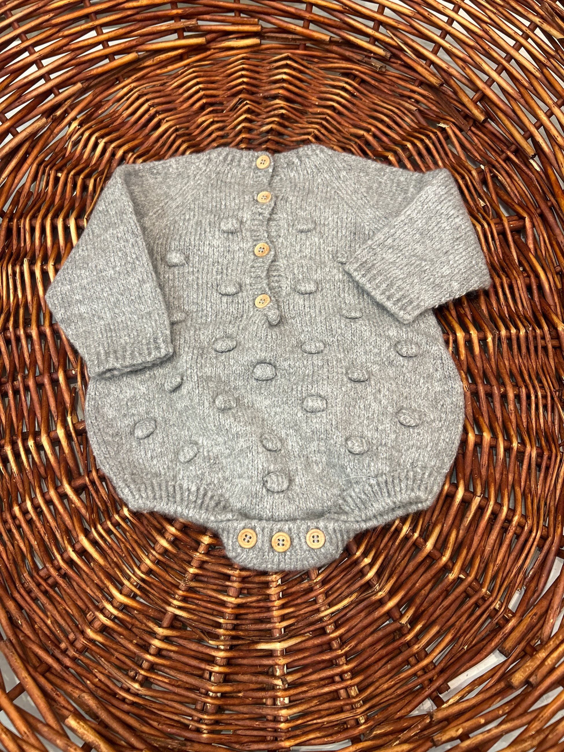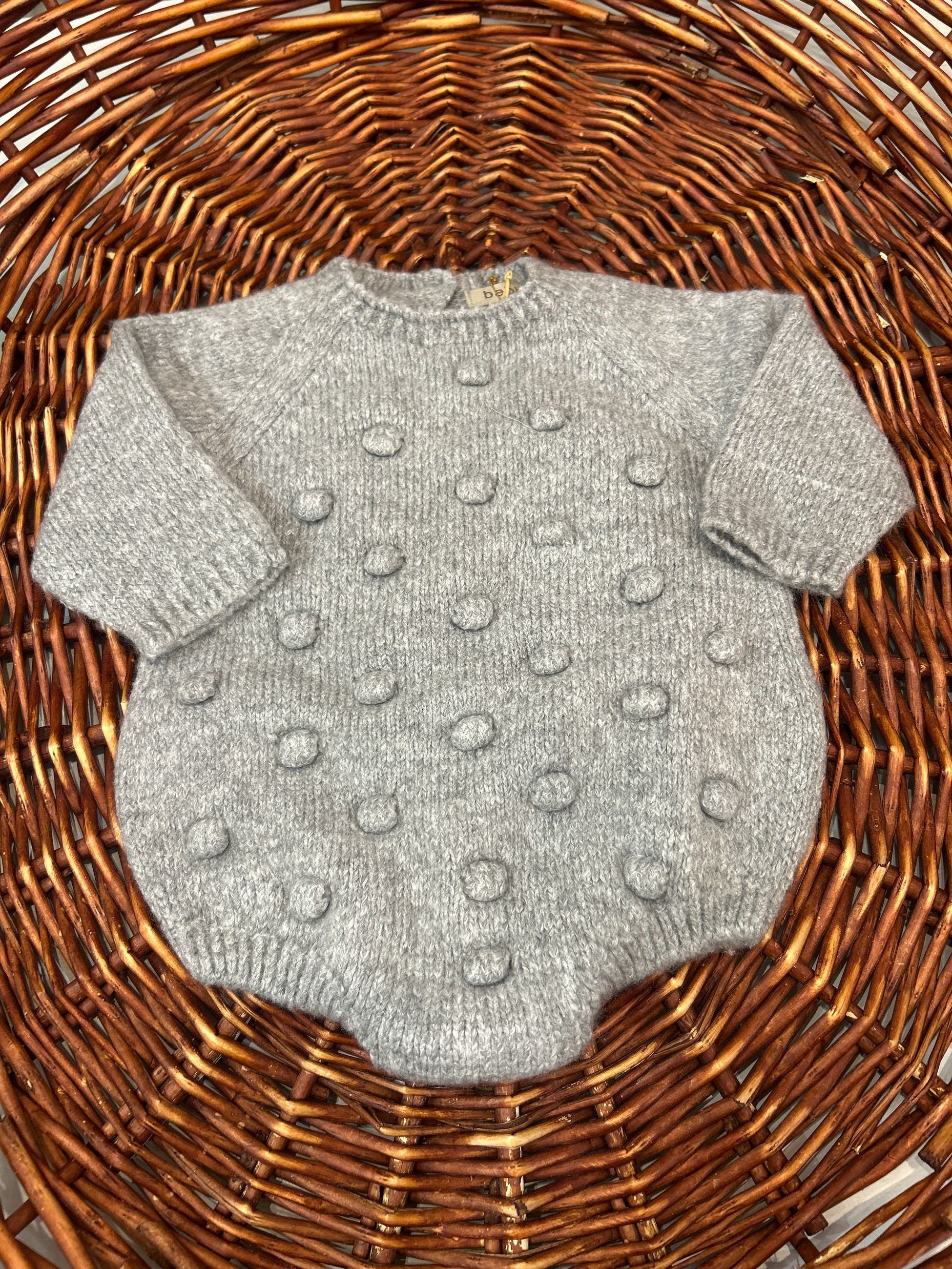 pagliaccetto in lana girocollo con pon pon rialzati, abbottonatura sul retro con bottoncini in legno